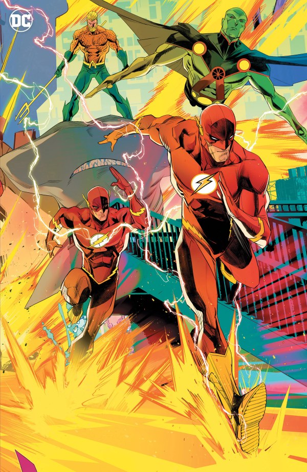 Barry Allen is the lone speedster to still have his powers, staying barely a step ahead of the Flash-themed Amazo, VELOCITY, now powered by the speed of the rest of the Flash Family.