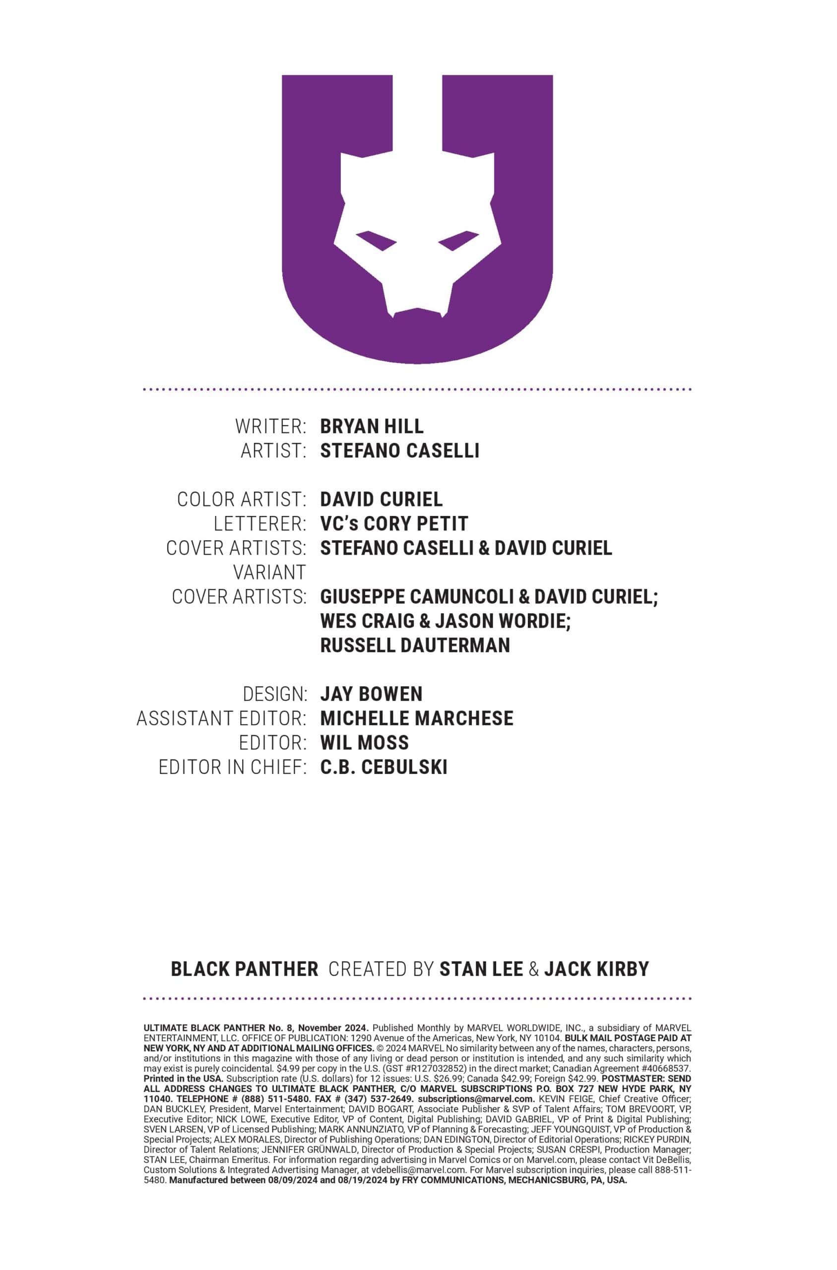 From the creative minds of Bryan Hill (BLADE, KILLMONGER) and Stefano Caselli (X-MEN: RED, AVENGERS) comes a bold new take on the world of Black Panther and Wakanda continues in Ultimate Black Panther #8