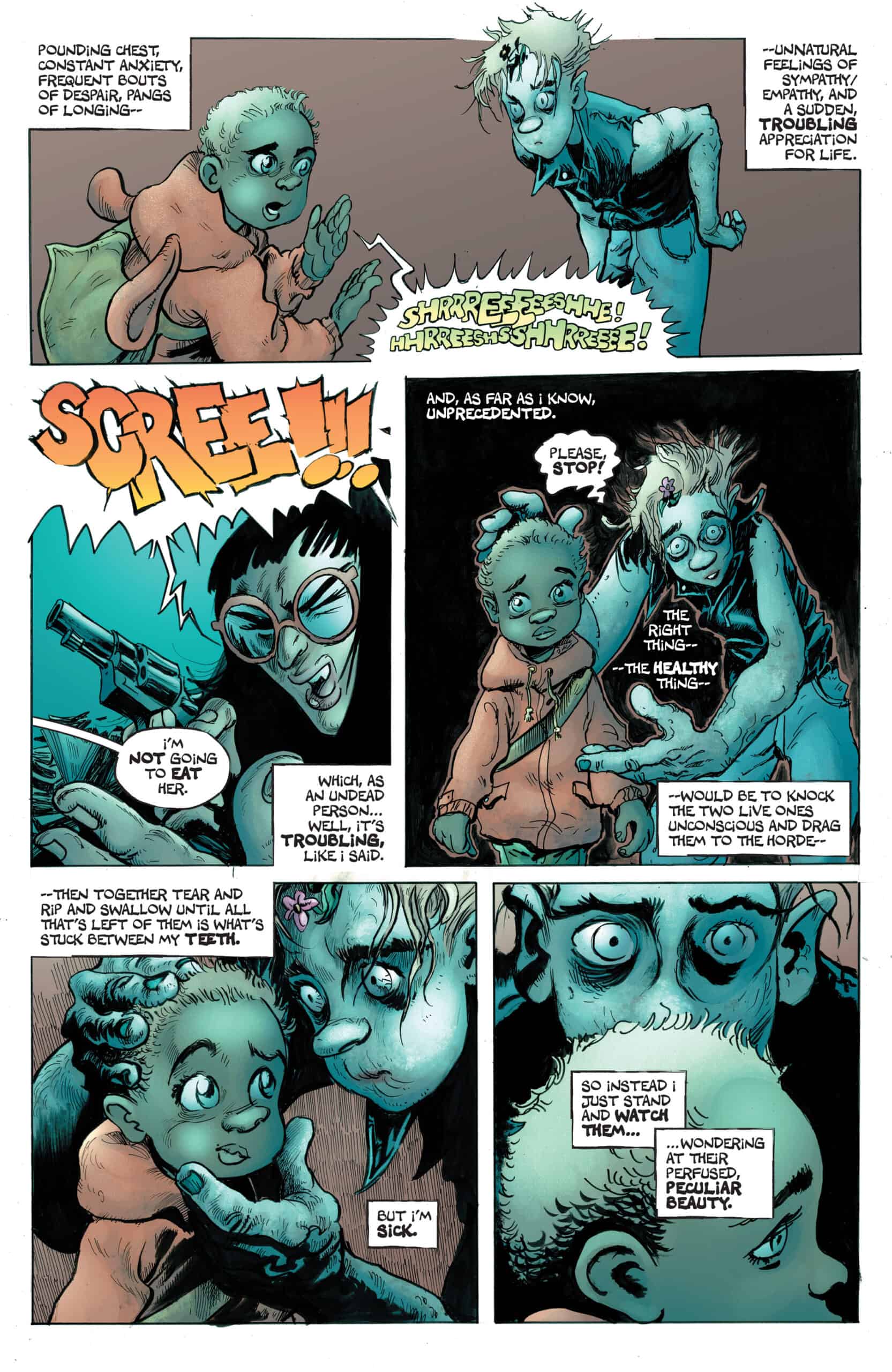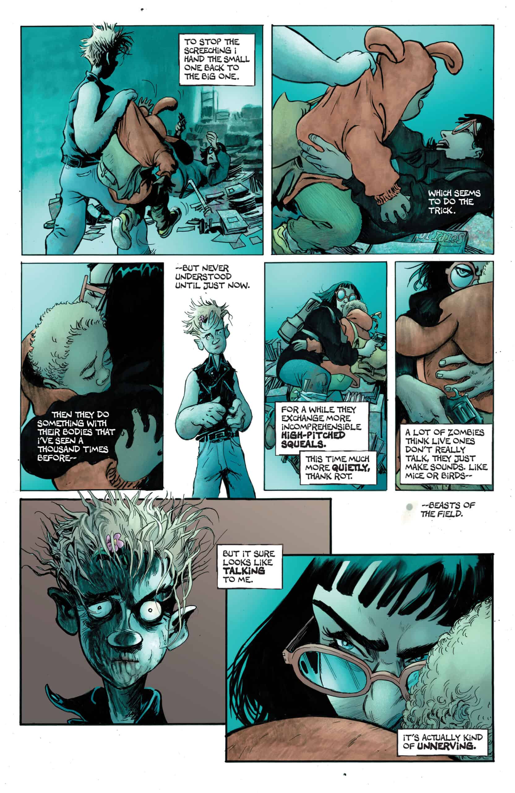 They’ve developed their own cultural practices, their own language, their own society. Mouse-Pokes-Golf-Ball-Through-Hole-In-Head (“Poke” for short) is a beloved member of his community, and with his brother-in-arm Mush, he’s happy to shamble along through the only world he can remember… until the day his heart mysteriously starts beating again.