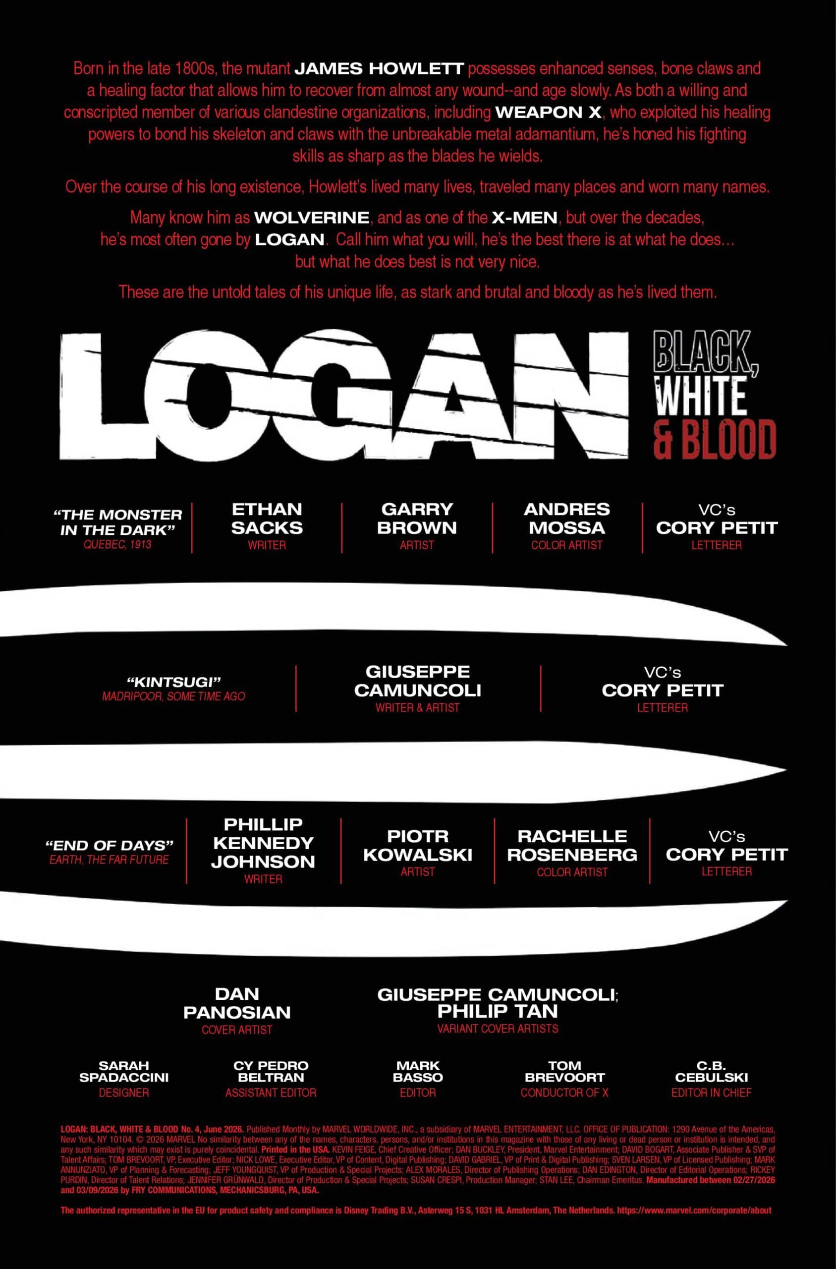 LOGAN: BLACK, WHITE & BLOOD takes things back to the beginning—telling never-before-told stories from Logan’s early history to his not-so-distant past and to present-day adventures and beyond!