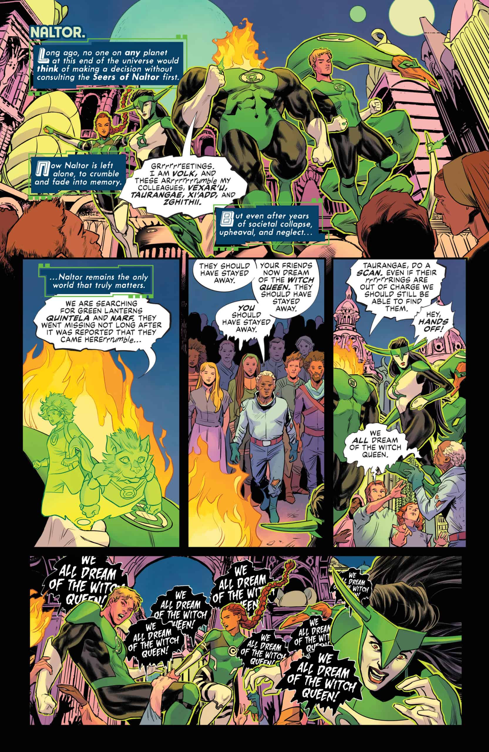 The planet Naltor and the Green Lanterns that protect it fall under the spell of the wretched Witch Queen, who harnesses the planet’s dream energy in hopes of taking over all that lies beyond.