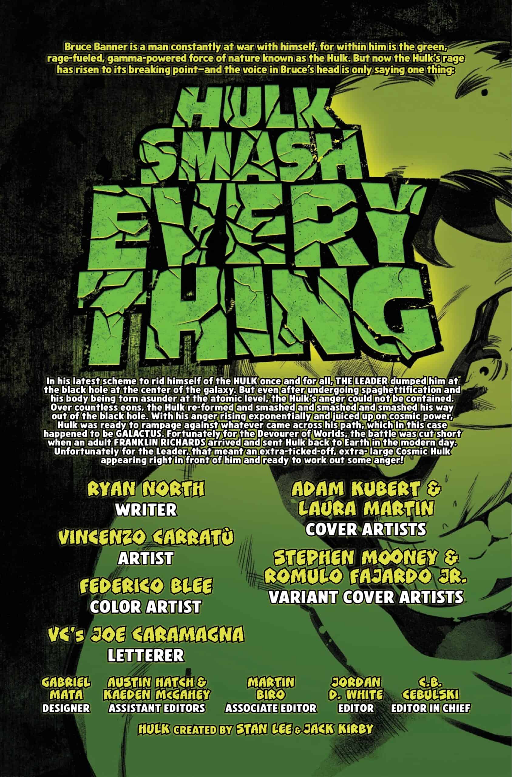 HULK: SMASH EVERYTHING, an awe-inspiring new epic from the minds of writer Ryan North (One World Under Doom, Fantastic Four) and artist Vincenzo Carratù (Psylocke, Dracula: Blood Hunt) kicks off this December. The five-issue limited series sees Hulk on a riotous rampage across time and space!