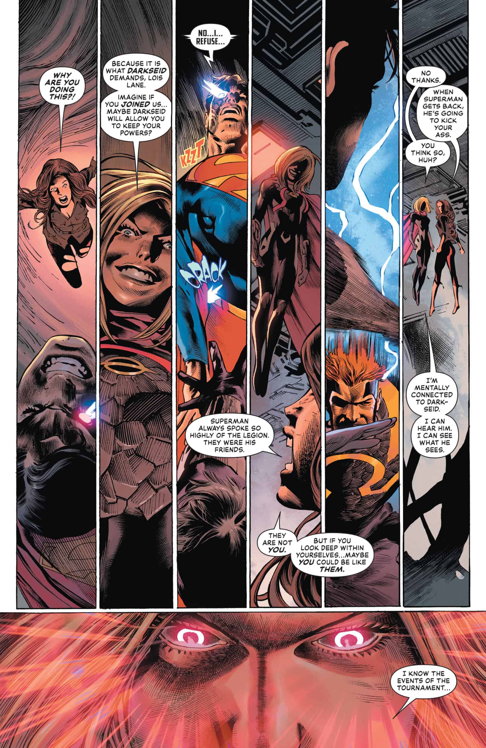 Superman’s time in the tournament has taken its toll. And now Darkseid’s Legion plans to make a massive sacrifice for their lord, and Time Trapper is too late to stop them. Only three unlikely heroes can show the corrupted Legion the light…