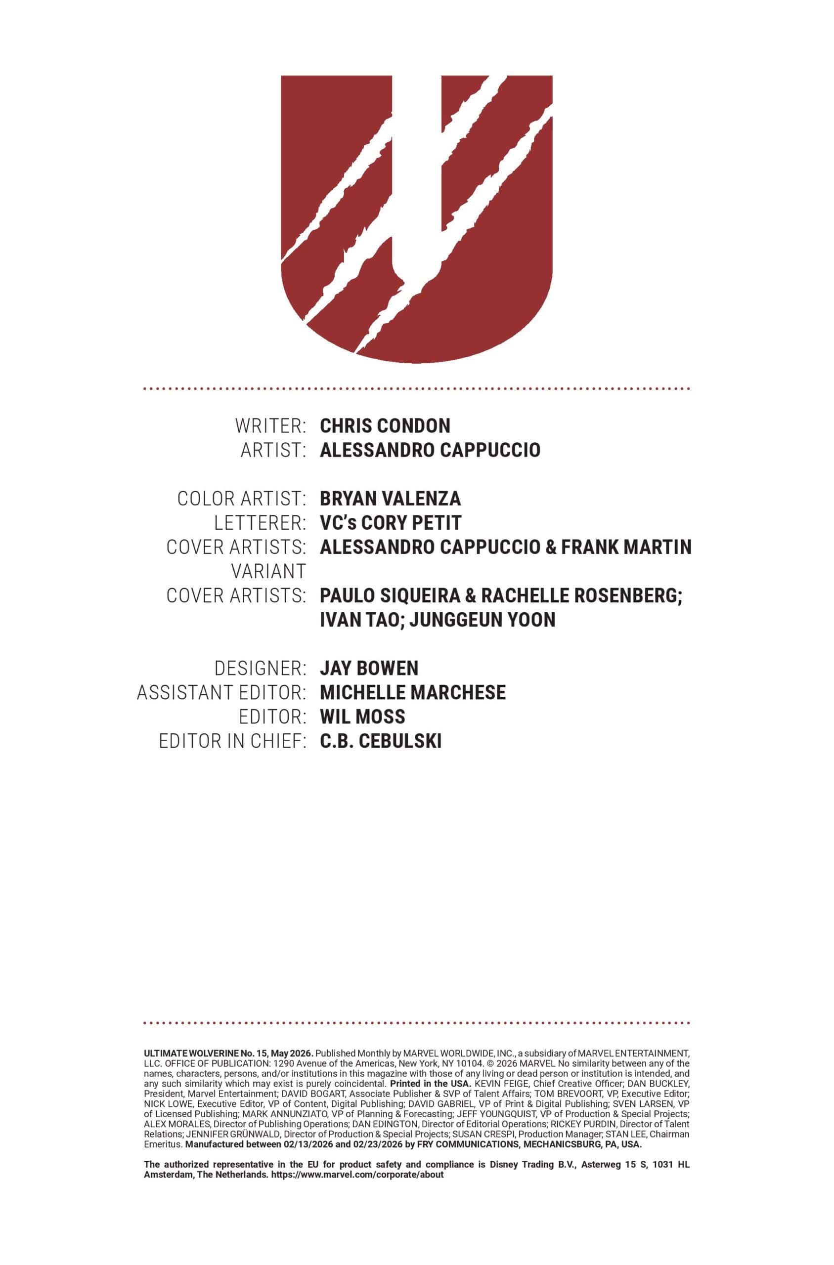 Rising star Chris Condon (That Texas Blood, Venom War: Daredevil) and powerhouse artist Alessandro Cappuccio (Moon Knight), launch the newest ongoing series of Marvel’s hit Ultimate line introducing Wolverine as the Winter Solider, an agent of the diabolical mastermind behind this corrupt world, the Maker