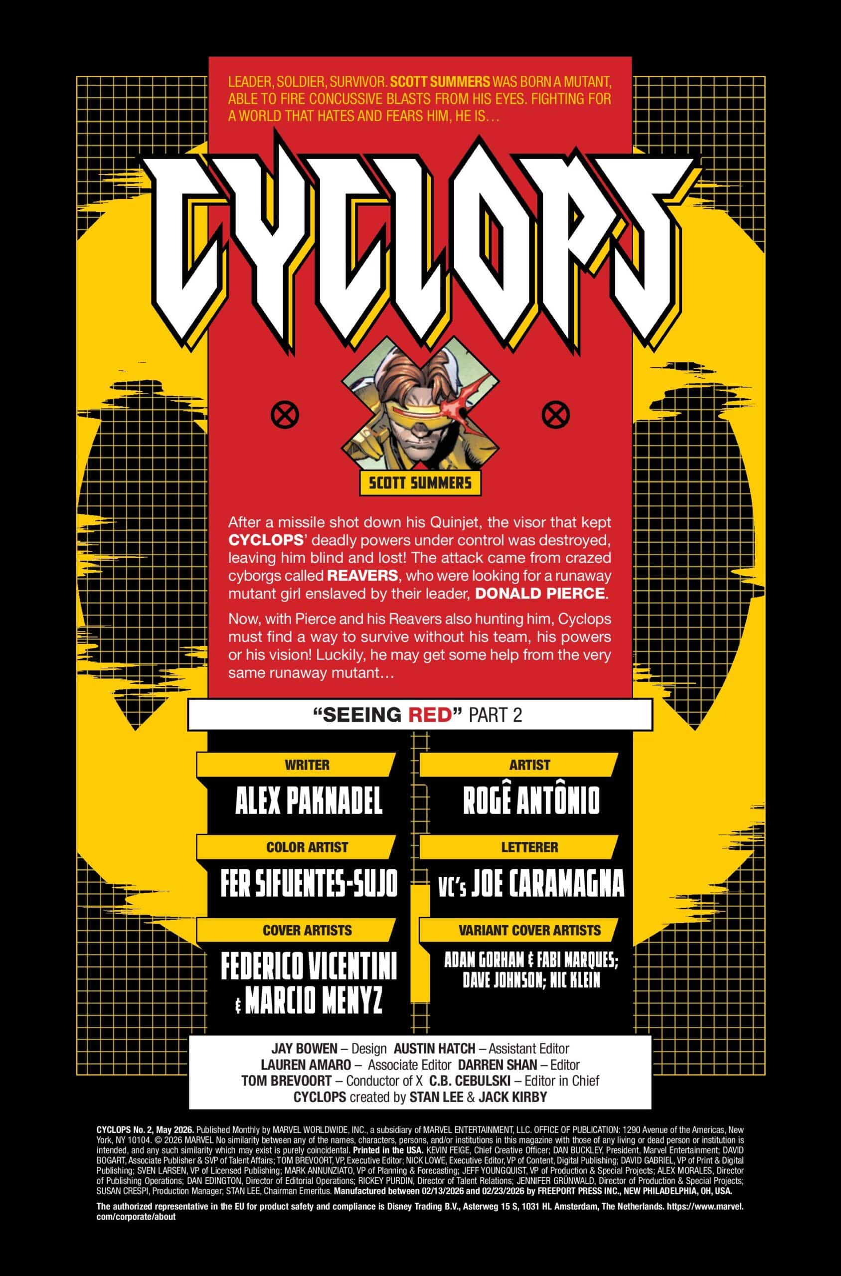 Virtually blind, Scott Summers must help a young mutant escape The Reavers in Cyclops #2, on shelves and digital platforms March 18, 2026, from Marvel Comics.
