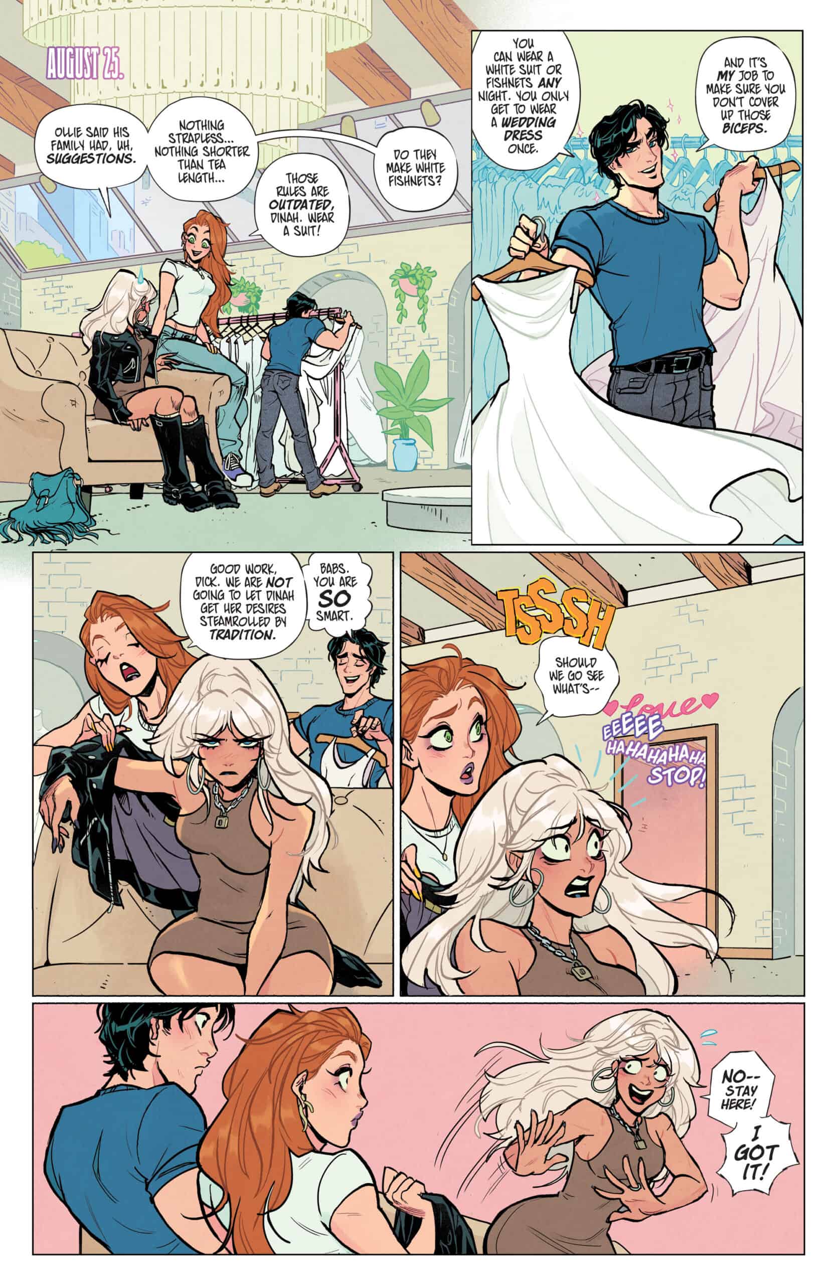 Catwoman ropes Batman into some steamy surveillance work, Harley and Ivy pour out the wine as they pore over evidence, and Canary… well, the only thing keeping her sane amidst wedding dress shopping and her too-fancy engagement party is getting her knuckles a little bruised and bloody during suspect interrogations.