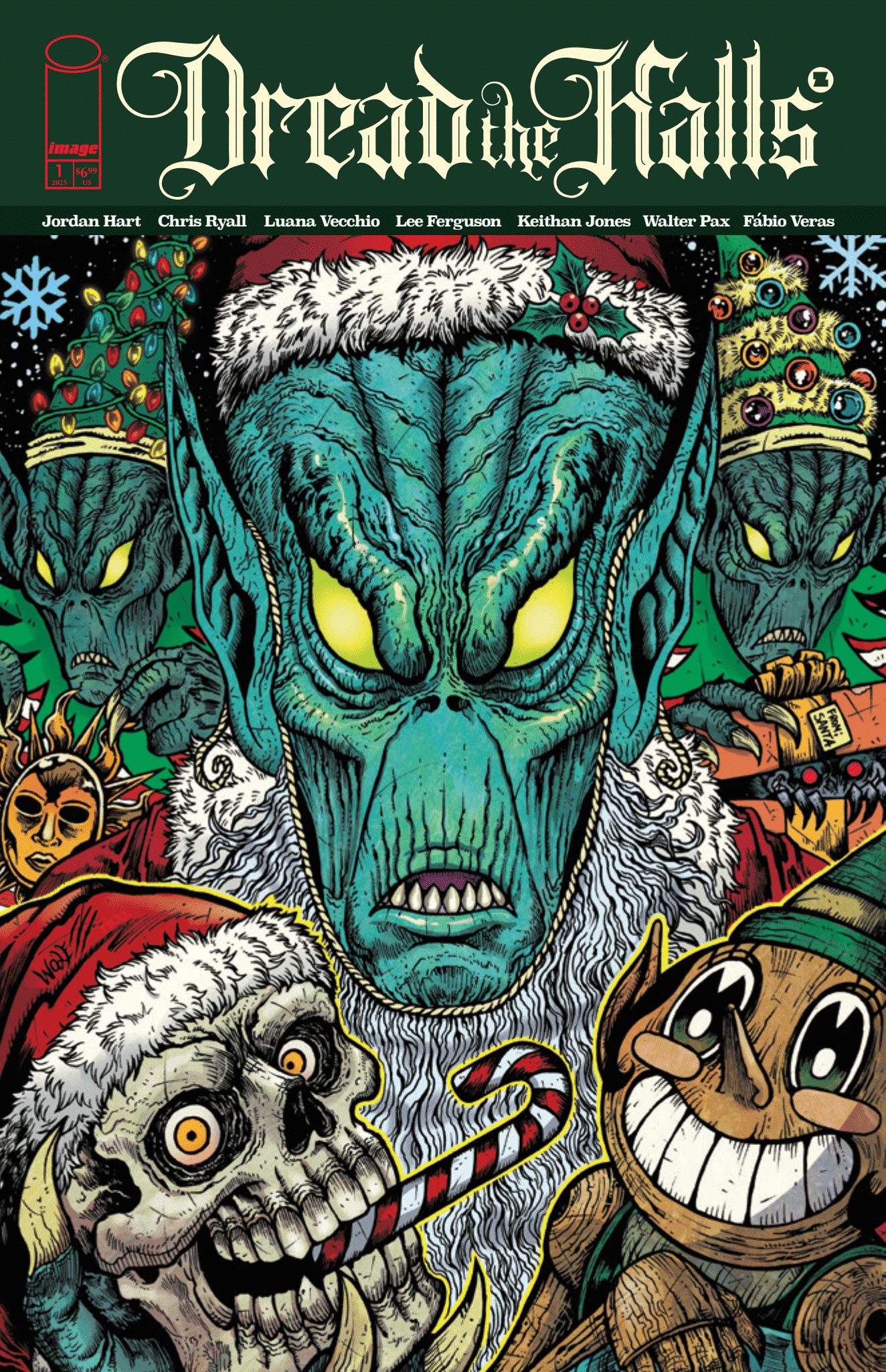 Dread the Halls returns to haunt another Christmas season with a 72-page gift of all-new tales of holiday horrors for only $6.99! This time out, Jordan Hart and Luana Vecchio deliver a seasonal blend of Hallmark movie and brutal revenge flick; Chris Ryall and Keithan Jones turn Mars red when “The Martians Conquer Santa Claus!”; Walter Pax and Fábio Veras return to the series rendering festive terror; and Ryall and Lee Ferguson present a pitch-black Christmas carol in “Chains Forged From Life.”