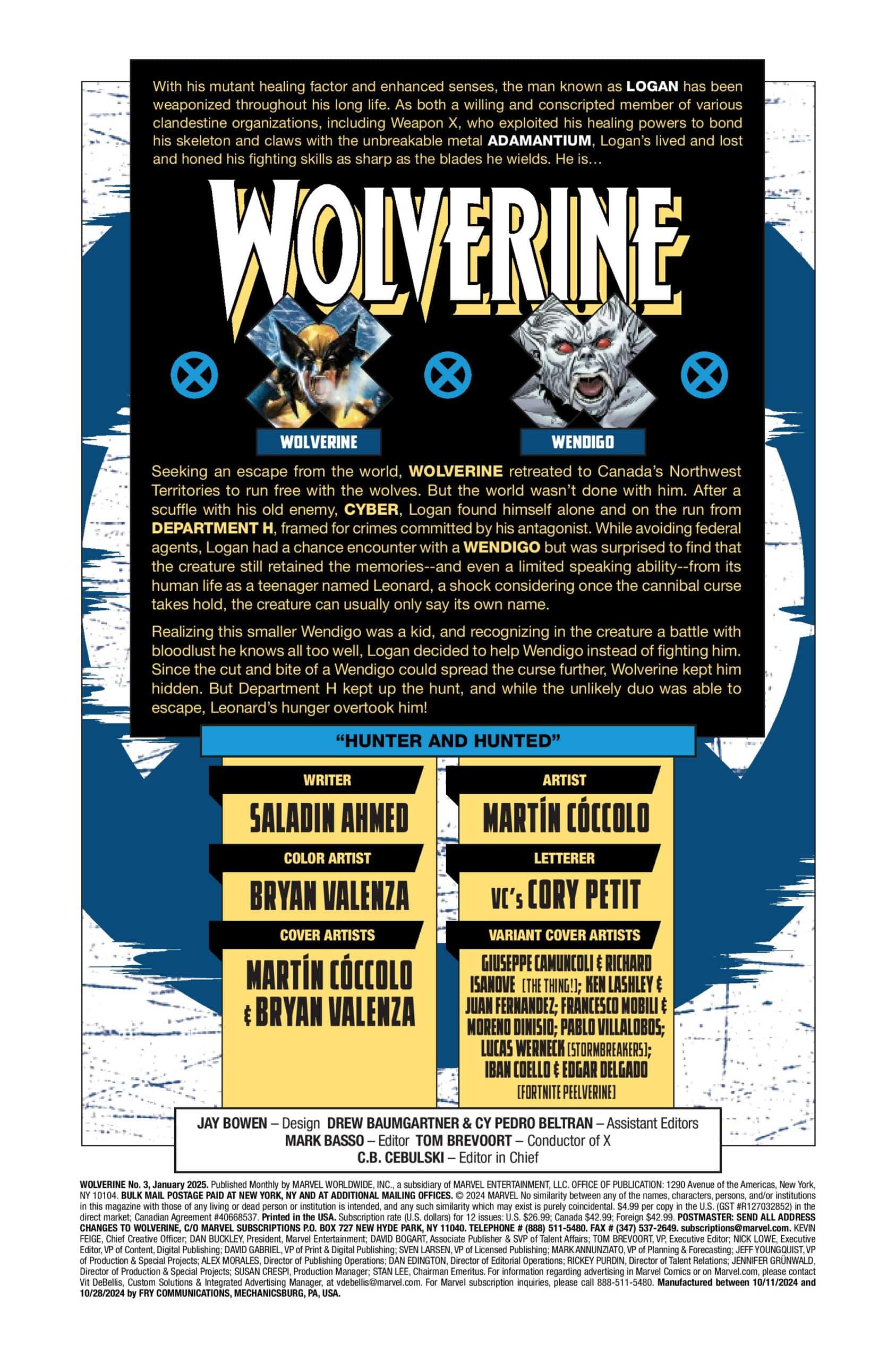 The legendary WOLVERINE ongoing series kicks off anew with the superstar creative team of Saladin Ahmed (DAREDEVIL, MAGNIFICENT MS. MARVEL) and Martín Cóccolo (DEADPOOL, IMMORTAL THOR) beginning their epic journey with Logan as Canada’s DEPARTMENT H has their sights trained once more on Logan in Wolverine #3