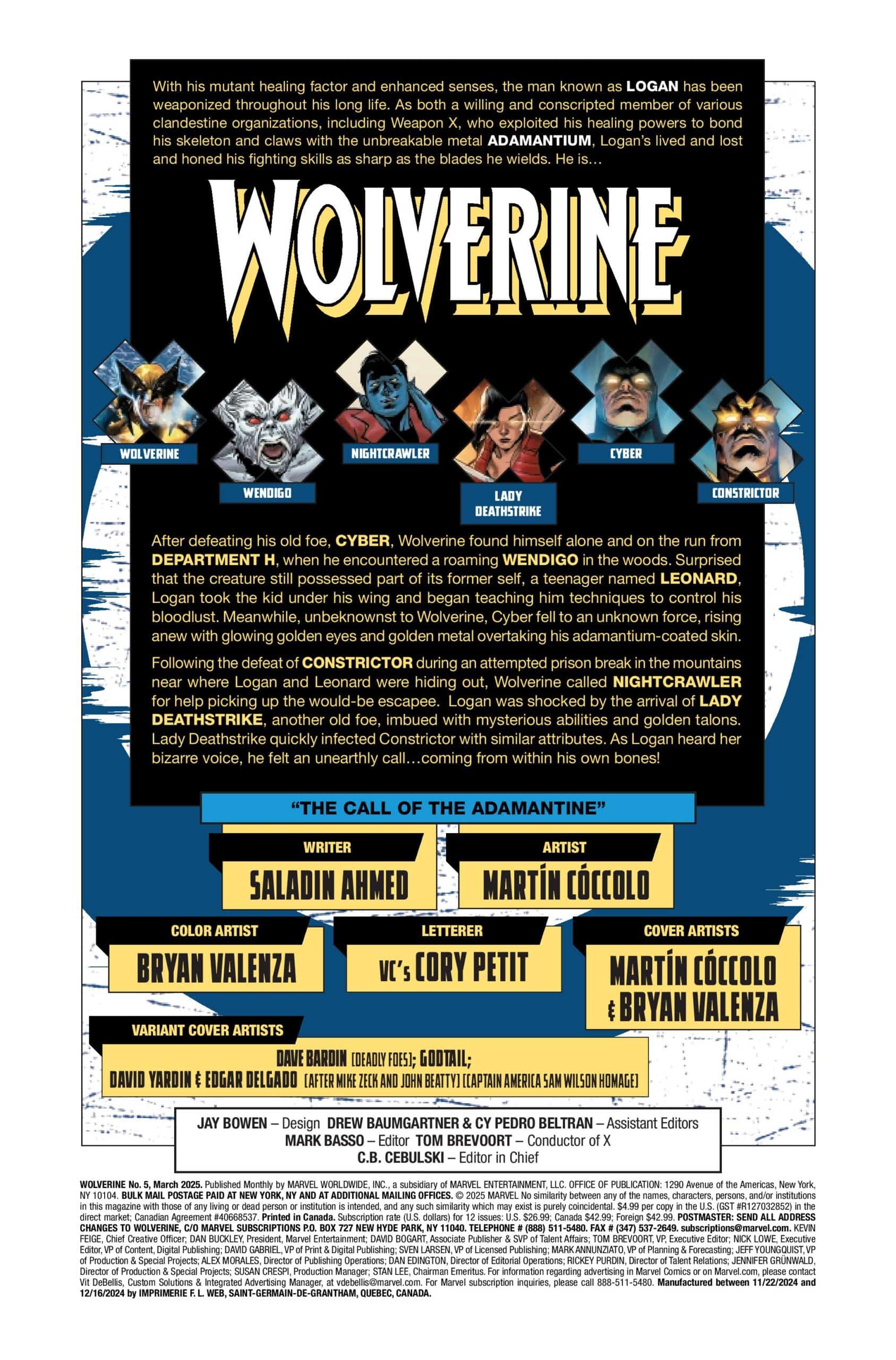 The legendary WOLVERINE ongoing series kicks off anew with the superstar creative team of Saladin Ahmed (DAREDEVIL, MAGNIFICENT MS. MARVEL) and Martín Cóccolo (DEADPOOL, IMMORTAL THOR) beginning their epic journey with Logan as Canada’s DEPARTMENT H has their sights trained once more on Logan in Wolverine #4