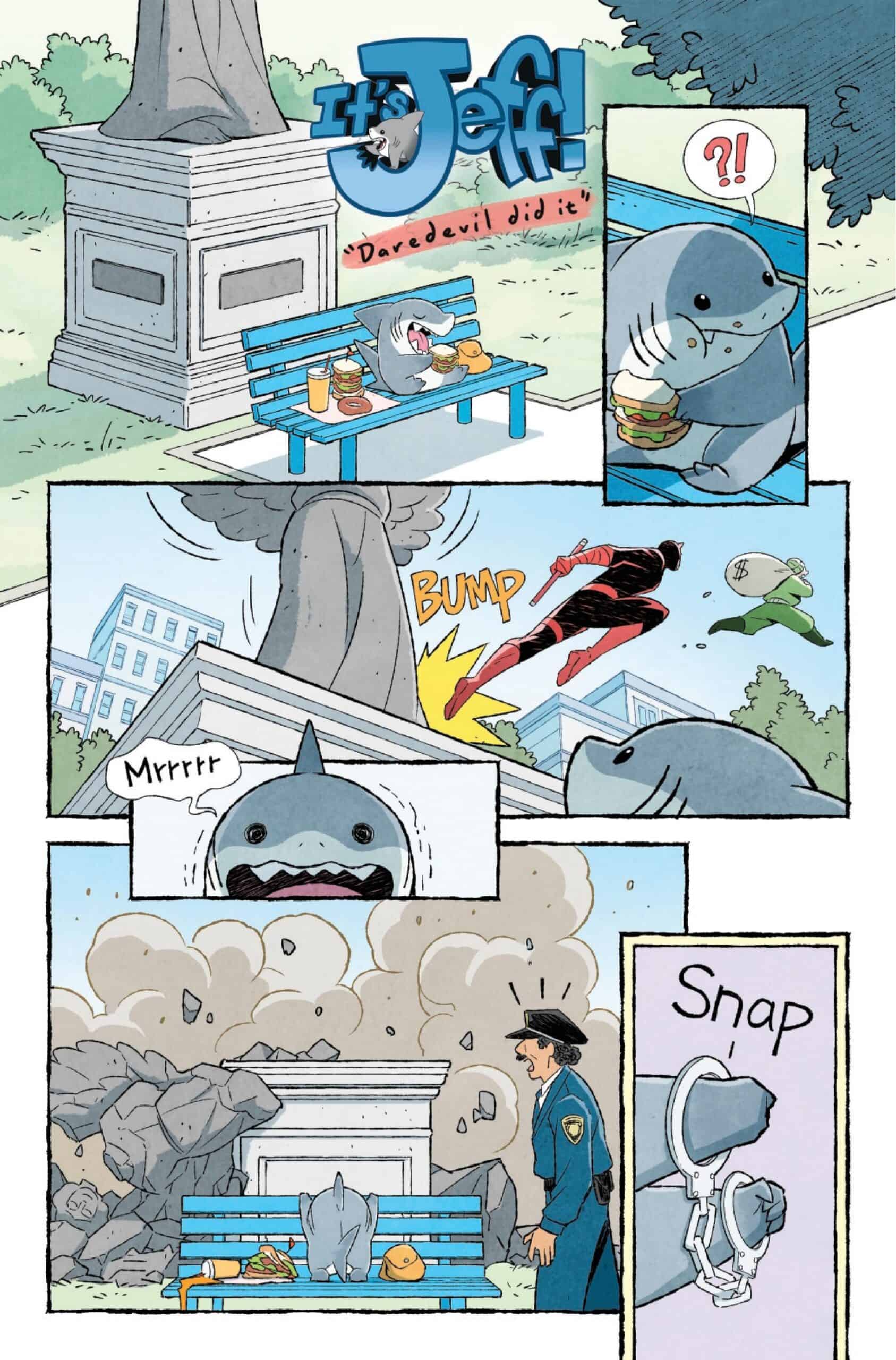 Superstar writer and Jeff the Land Shark co-creator Kelly Thompson and acclaimed artist duo and Marvel Stormbreaker artists Gurihiru continue their Eisner-winning work on It’s Jeff this February in IT’S JEFF MEETS DAREDEVIL!