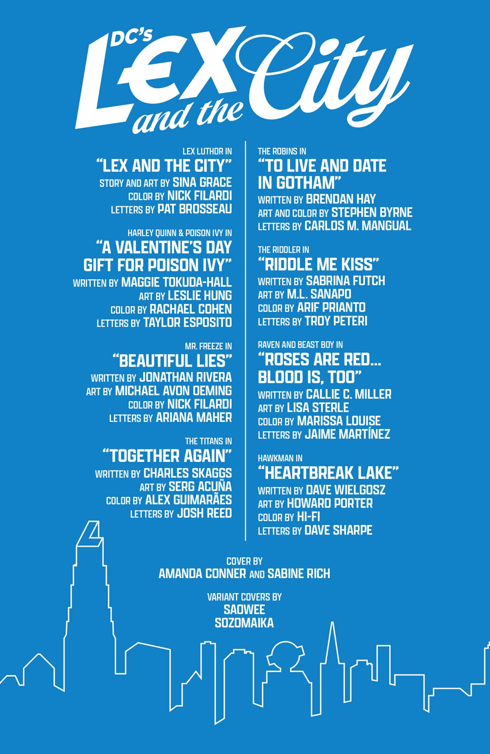 Eight stories of heroes and villains looking for love in the big city (which practically feels like its own character!). Lex Luthor laments over the one that got away — the big, ever-elusive Metropolitan man, Superman! Raven and Beast Boy embark on a romantic scavenger hunt across San Francisco (which just might be a trap)! And Damian Wayne runs a dating-advice gauntlet through Gotham City, organized by none other than the dating master himself, Tim Drake