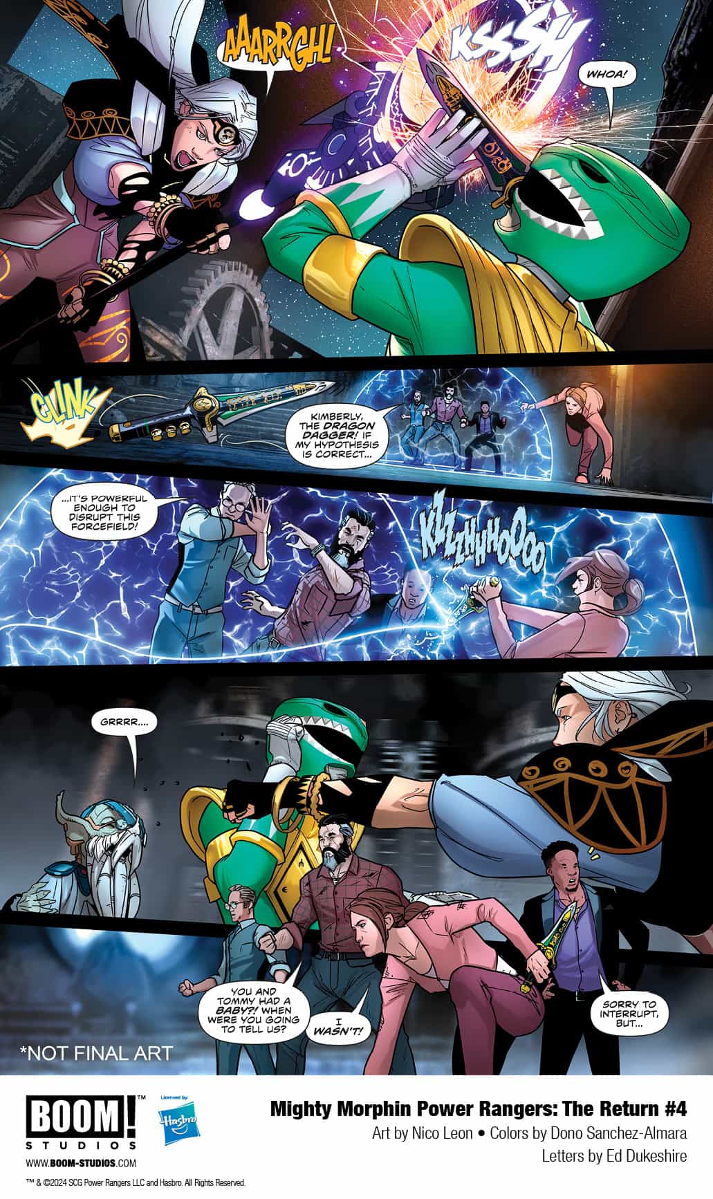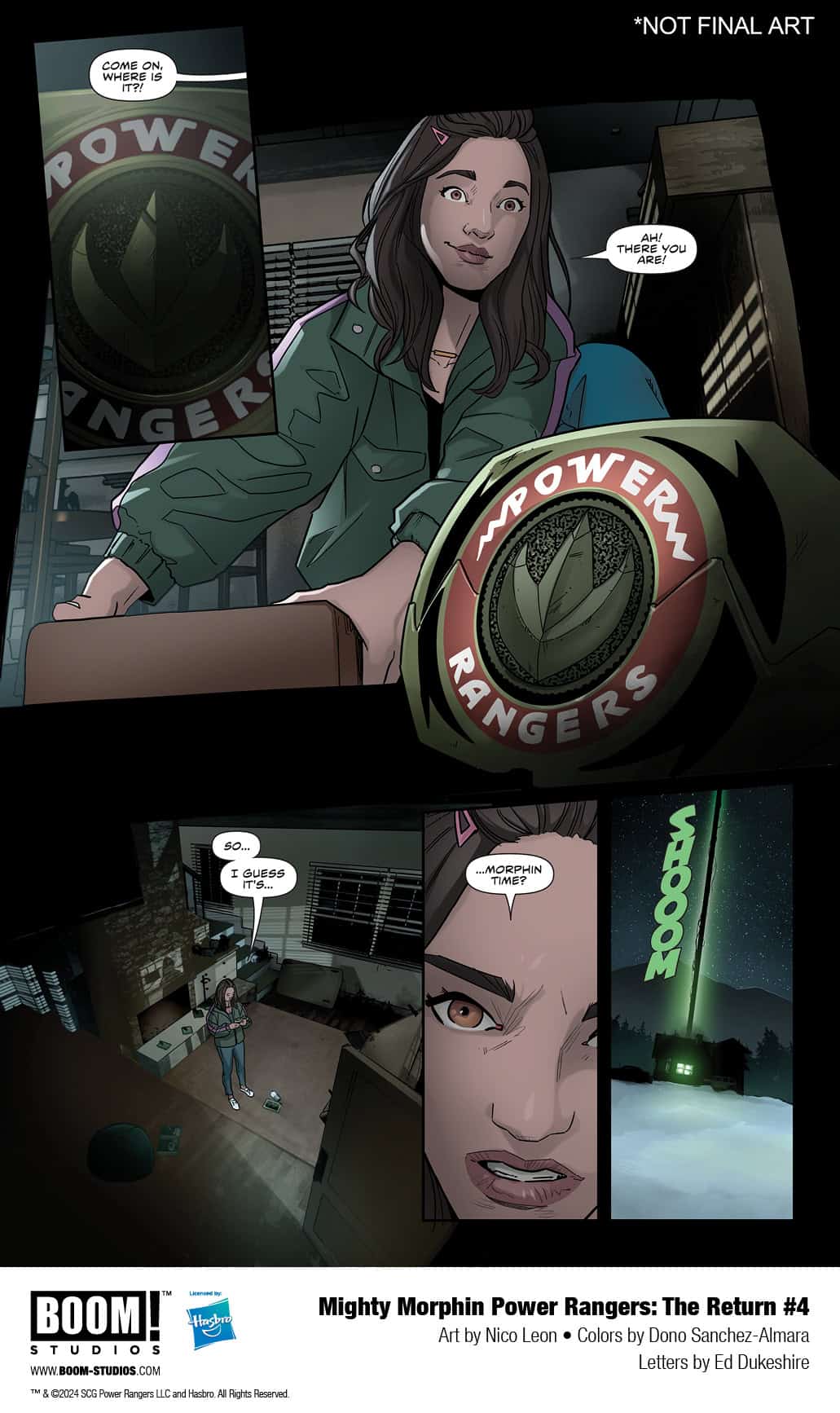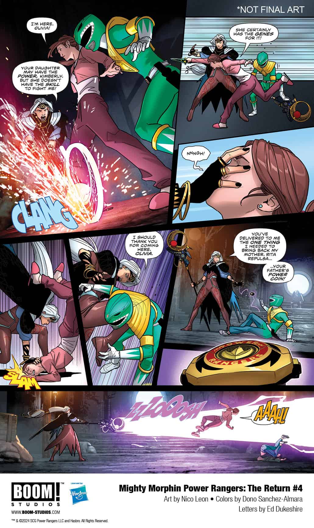 BOOM! Studios unveiled a first look at the final issue of Mighty Morphin Power Rangers: The Return. The four issue miniseries features writing by original Pink Ranger Amy Jo Johnson and Matt Hotson with art from Nico Leon, coloring by Dono Sanchez-Almara, and lettering by Ed Dukeshire. Releasing later this month, the series follows as a new Green Ranger is revealed as the team prepares for a climactic battle.