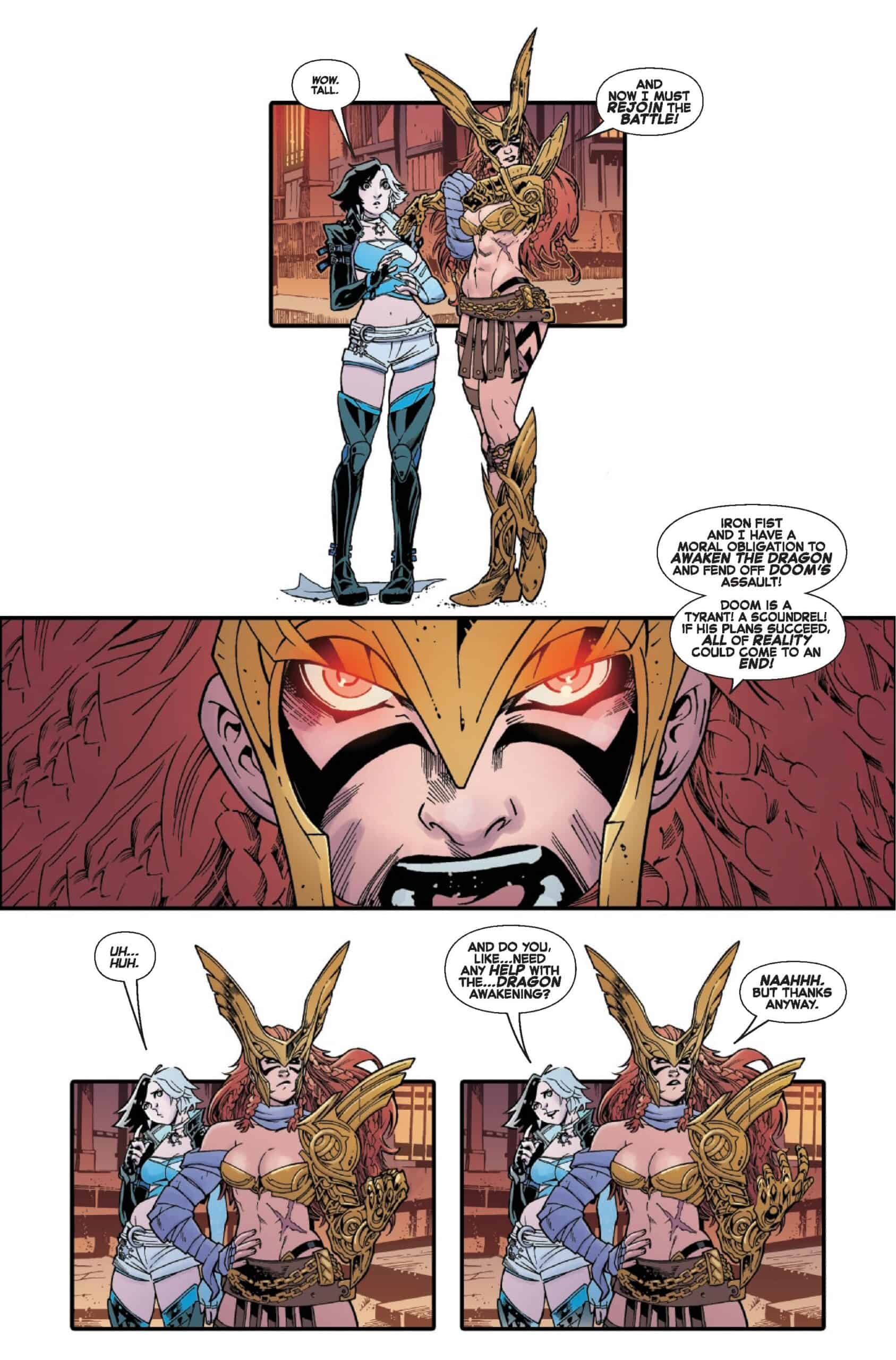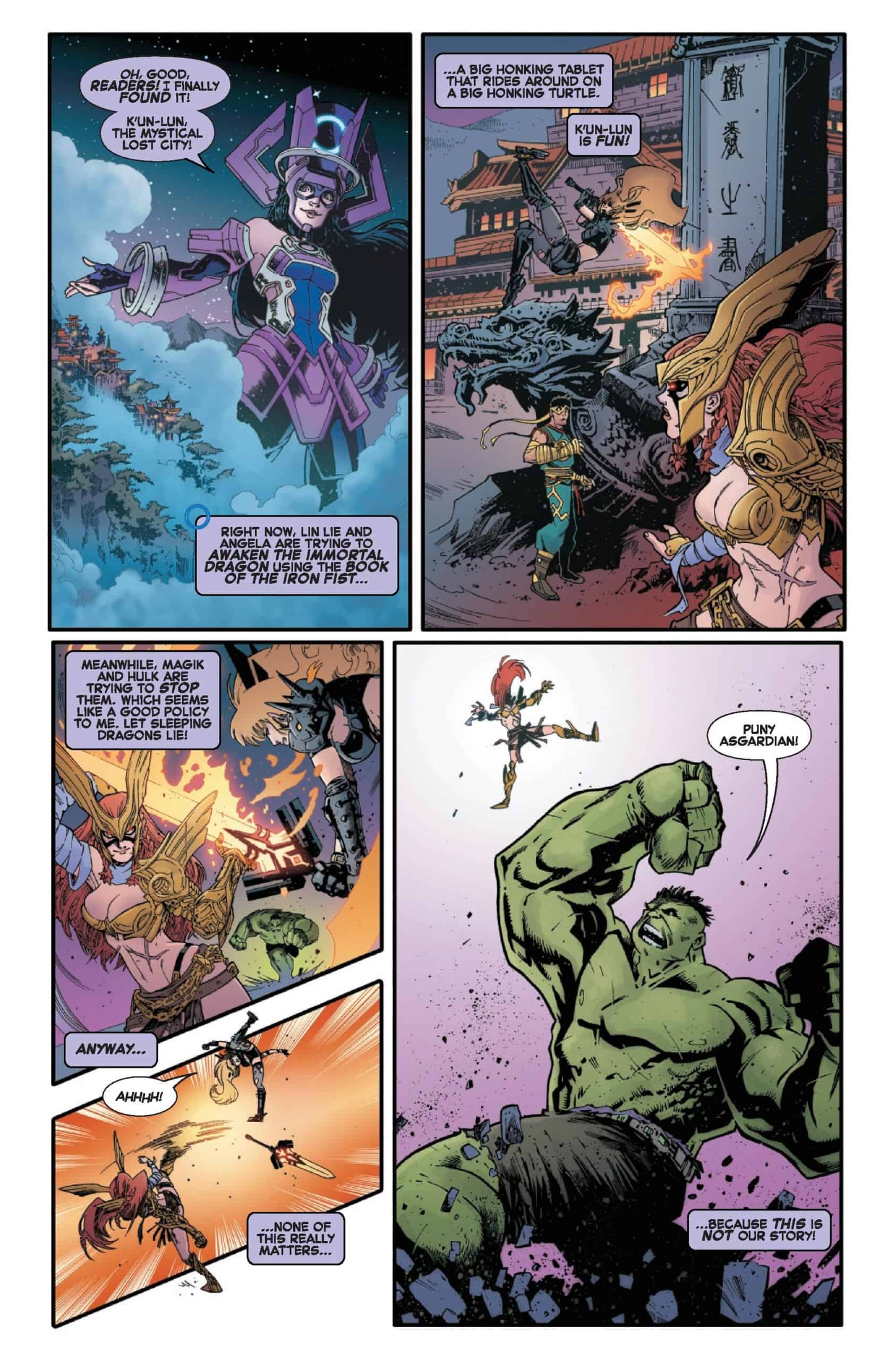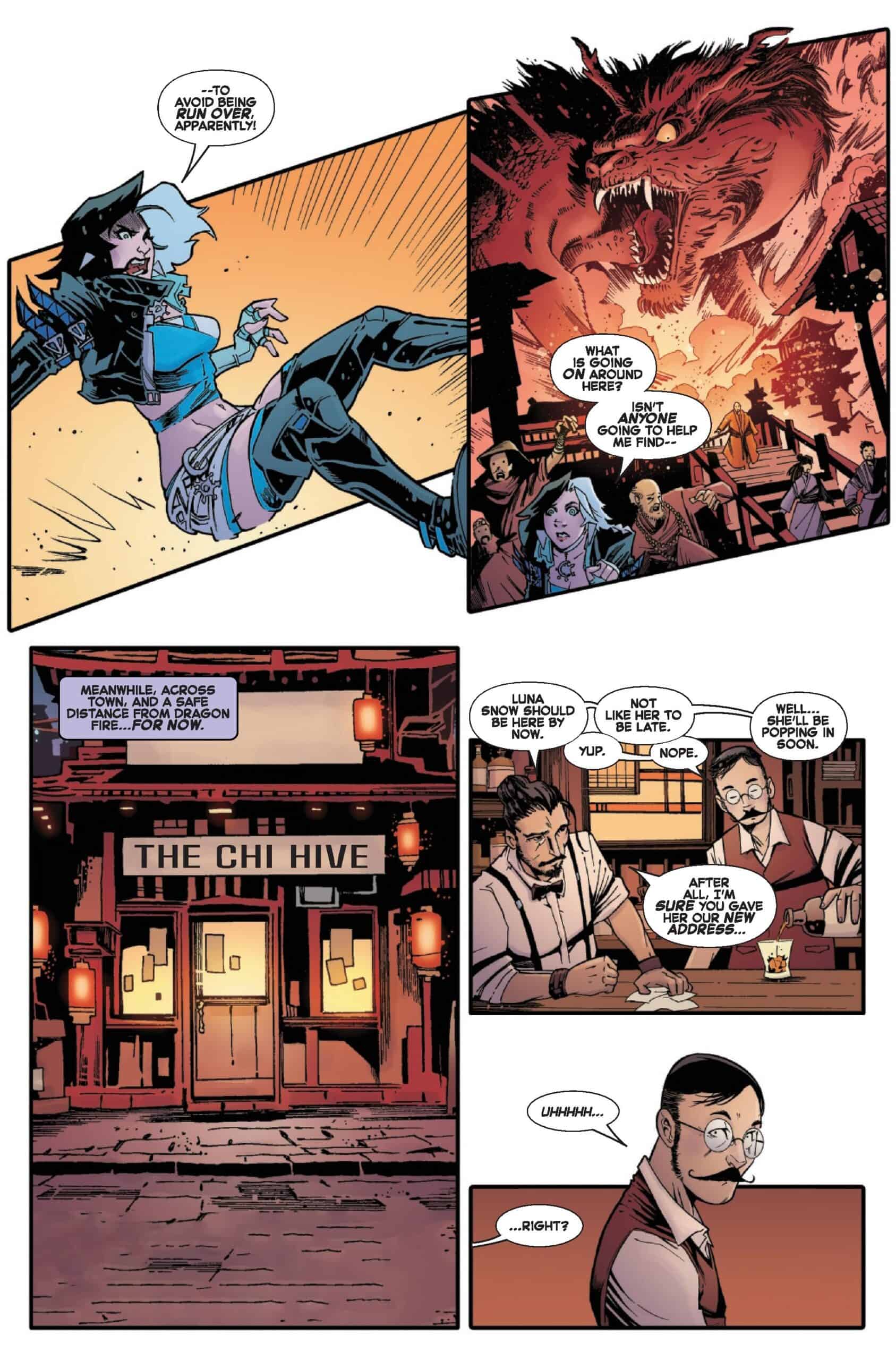 Luna finds herself enroute to career-making concert, taking place at the mystical Chi Hive tavern in K’un-Lun, and getting there isn’t easy. On her search, she stumbles into a clash of titans: Daredevil and Angela attempting to awaken the Immortal Dragon with the Book of the Iron Fist, opposed by Magik and Hulk, who are determined to stop them.