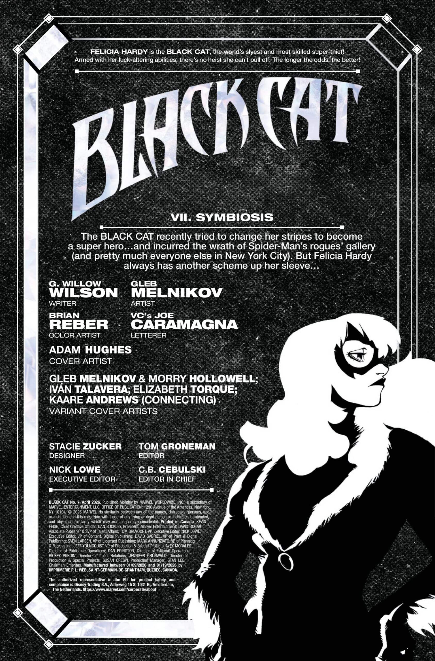 Superstar G. Willow Wilson joins rising star Gleb Melnikov to chart the winding road of twists and turns, laughs and mind-bending action of Black Cat’s next exciting chapter continues as Marvel’s most unexpected duo is back in Black Cat #7