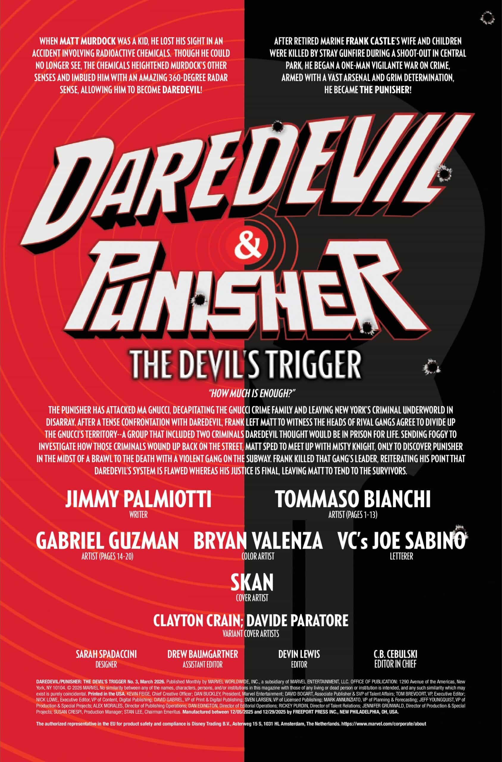 Matt and Frank will have to put aside their differences to save NYC in Daredevil / Punisher: The Devil’s Trigger #3 on shelves and digital platforms January 21, 2026, from Marvel Comics
