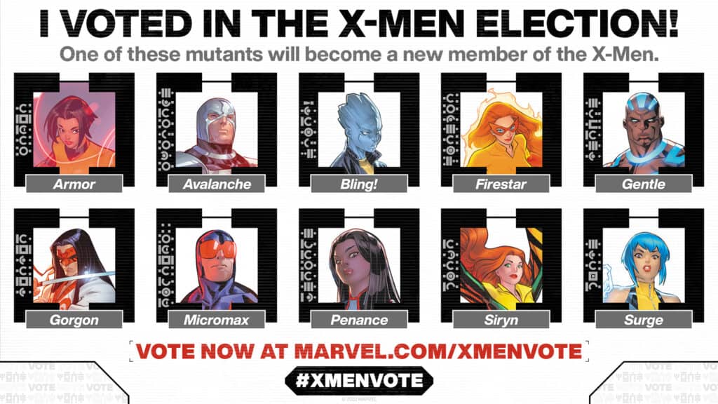 New York, NY— January 10, 2022 — Marvel is looking to the fans to help select the newest X-Men team once again! Following the success of last year’s X-Men election, the second annual event to choose the newest protectors of Krakoa will run from January 10 at 9:00amEST until 11:59pmEST on Thursday, January 13. Participants can vote at marvel.com/xmenvote.