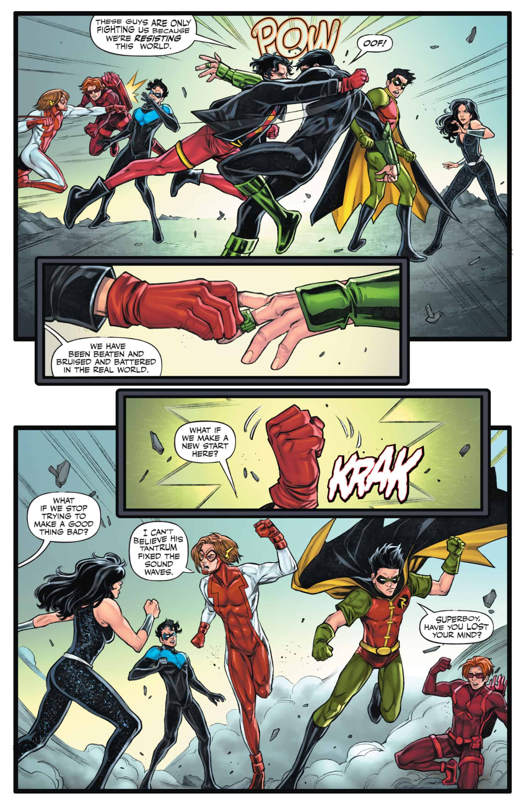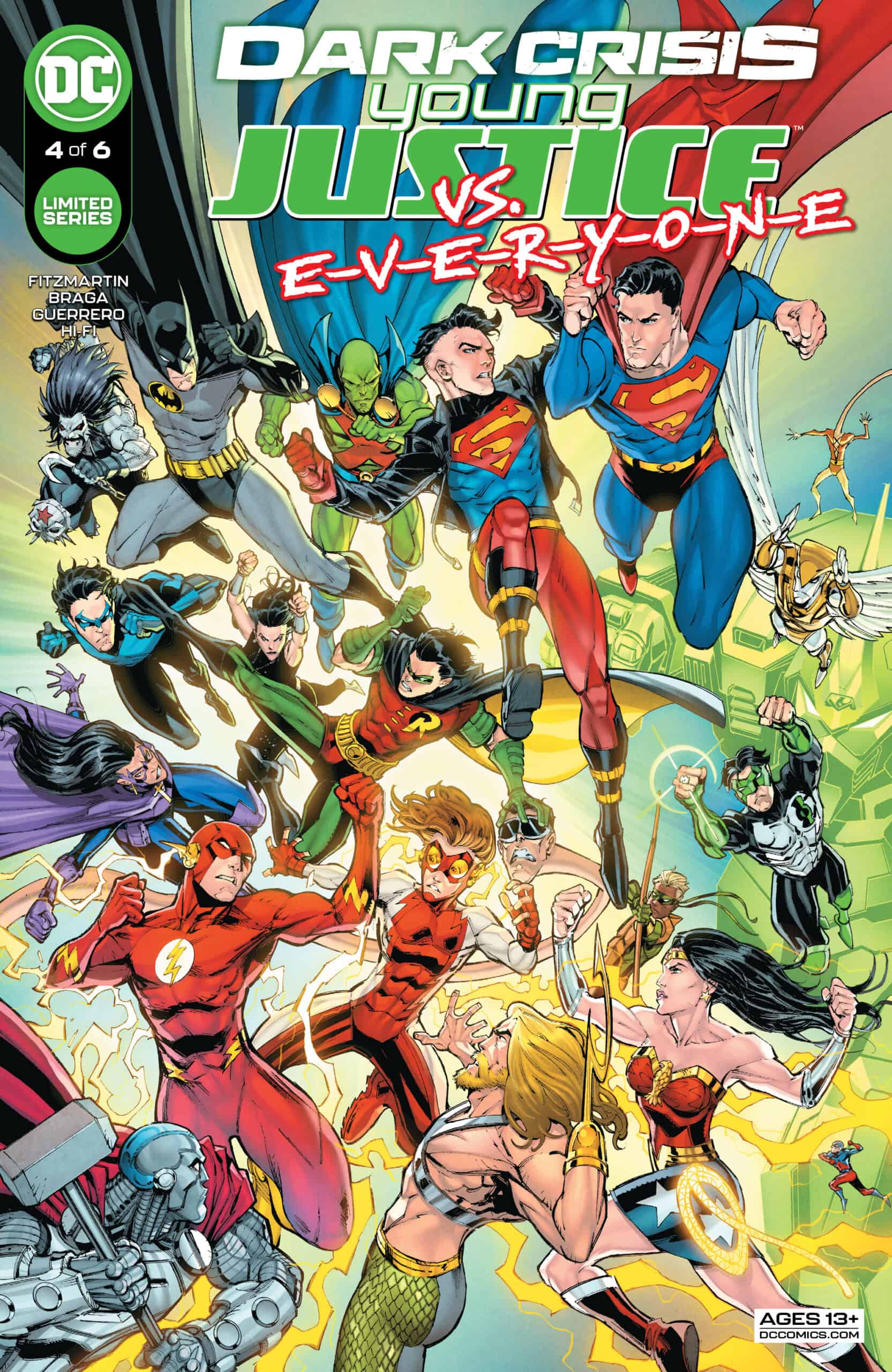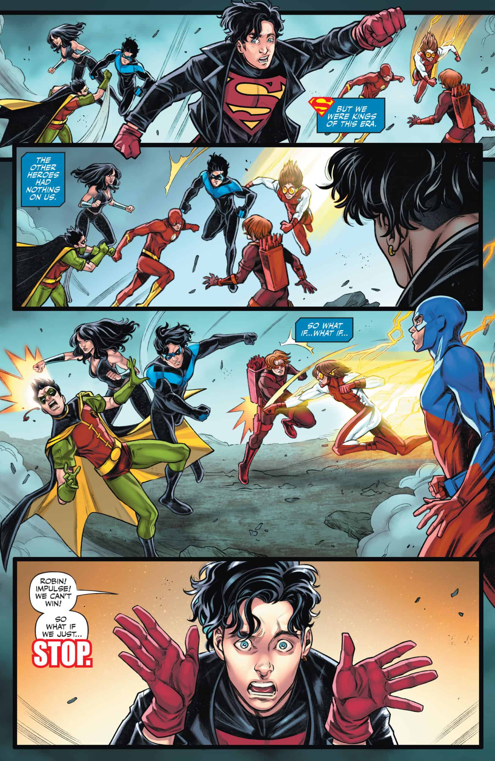 Young Justice against the world! The fake reality that Superboy, Impulse, and Robin are trapped in has completely turned against them, sending the full force of the JLA and the Titans they grew up with against them. It will take all of their combined might to fight through this onslaught and find out who is responsible for their imprisonment. Meanwhile, Wonder Girl, Arrowette, and Red Tornado head to San Francisco’s Titans Island in search of assistance, but all they find are bad memories.