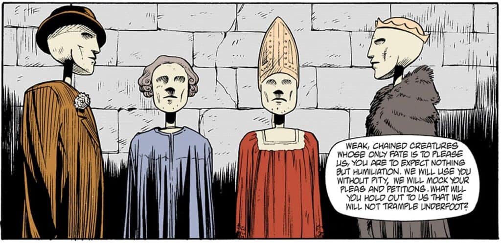 Even as fictional characters in a fictive world, if we frame Sir Miles’ arrangement of child murders, of rapes and kidnappings, assaults and tortures, as morally equative to joyriding, tagging, dispersing satirical flyers, or even King Mob’s violent prison breaks or gunplay, are doing damage. These lines of thought and discussion inspire us to frame real circumstances similarly until war criminals and heroes sit side by side to watch professional sports and pass their candy back and forth.