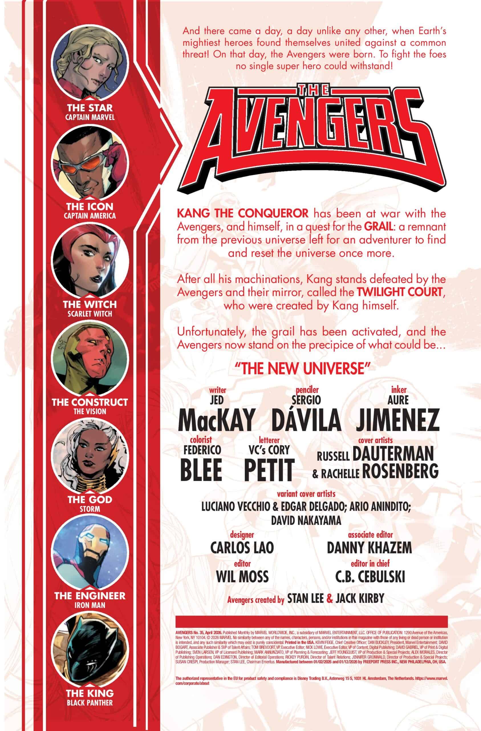 The Earth’s Mightiest Heroes and Twilight Court must face the destruction of the universe in The Avengers #35, on shelves and digital platforms February 4, 2026, from Marvel Comics