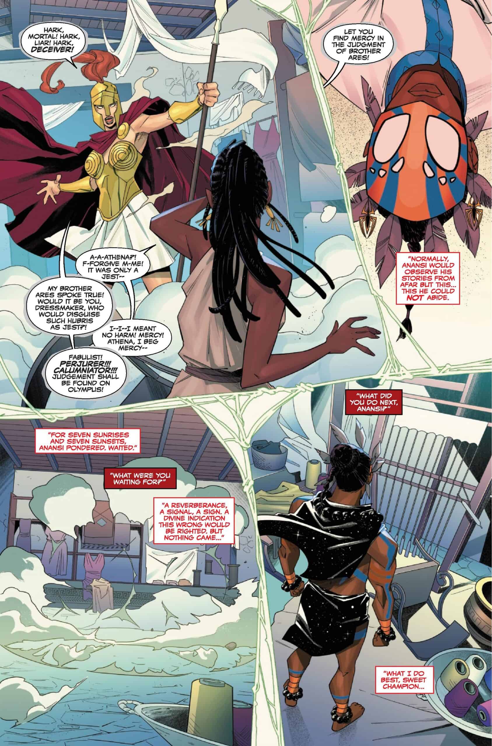ANANSI, the story-weaving SPIDER-GOD, chooses MILES MORALES as his champion in a contest between gods — and their mortal heralds — to settle his ancient blood feud with ARES, GOD OF WAR, once and for all.