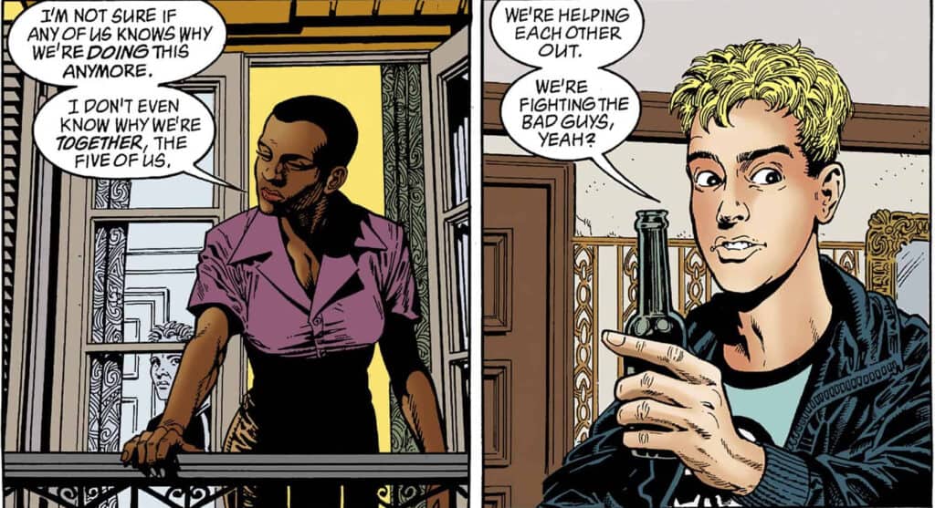 In The Invisibles, a character like Mason Lang, a billionaire, and the Marquise de Sade, a royal, will always be suspect, but King Mob tells us how shallow he is, characters critique him constantly, while as audience, we tend to be fine overlooking that he is monied, that he is a straight-seeming, fit white man with an English accent , in favor of seeing his arc into enlightenment and betterment in isolation. The decrying of Boy or Jolly Roger for not making the leaps he makes, when he finally makes them, that they are vengeance-driven or angry and he is flippant and just kind of annoyed when he kills people, has to ignore both the actual chronologies, and that Boy and Roger – a Black woman sometimes exoticized by her own white friends, and a white lesbian who grew up poor and abused – occupy very different cultural space than King Mob, a millionaire with apparently cool parents and an ethnicity which connotes, for many, education, intelligence, and capacity.