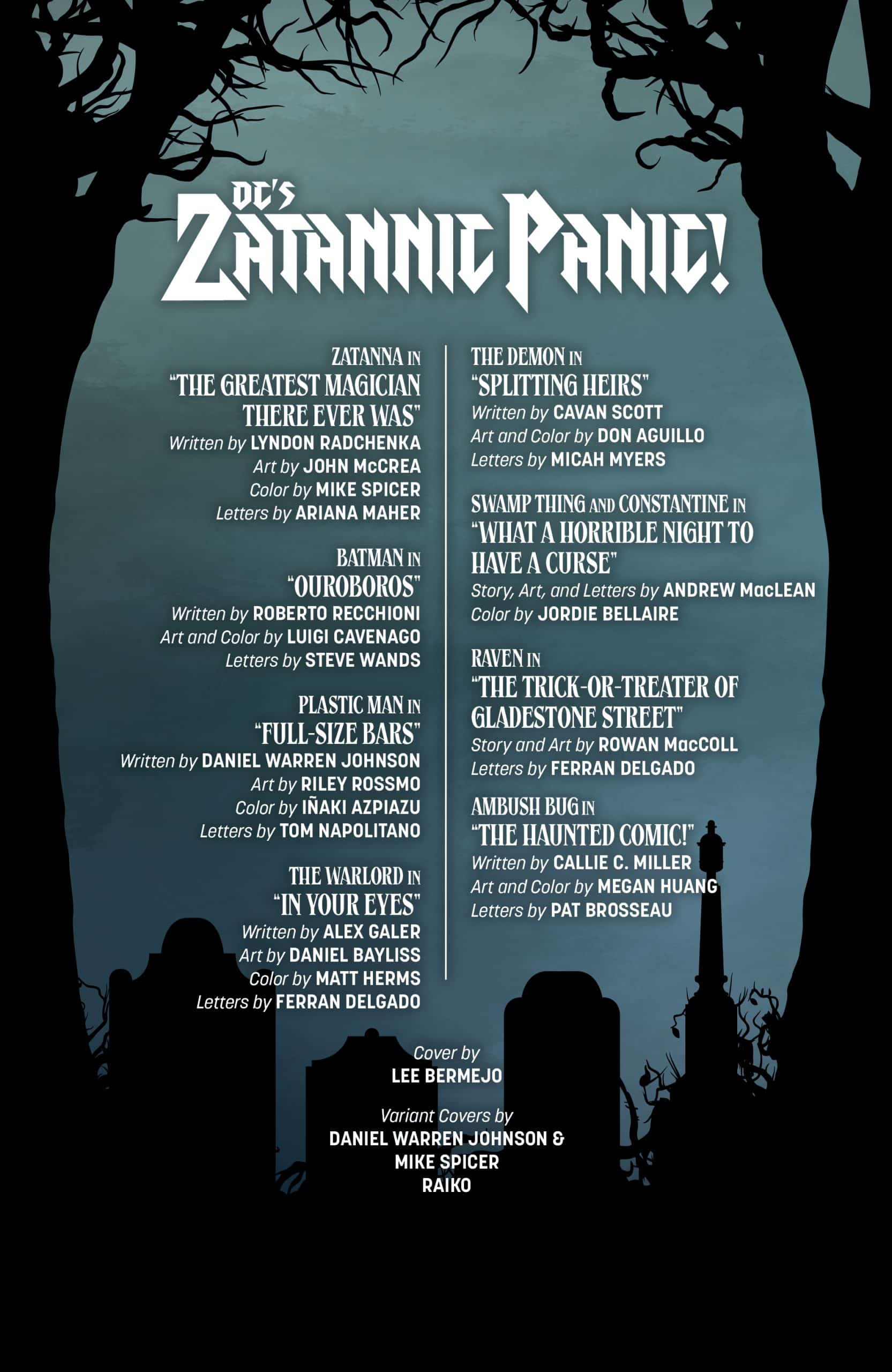 Spooky stories for terrifying times, featuring bone-chilling tales from some of comics’ most fearsome fabulists and harrowing artists! With spine-tingling shorts starring Batman, Ambush Bug, Raven, The Demon, Plastic Man, Swamp Thing, and, of course, the Mistress of Magic herself, Zatanna, as they summon spirits and struggle against the supernatural