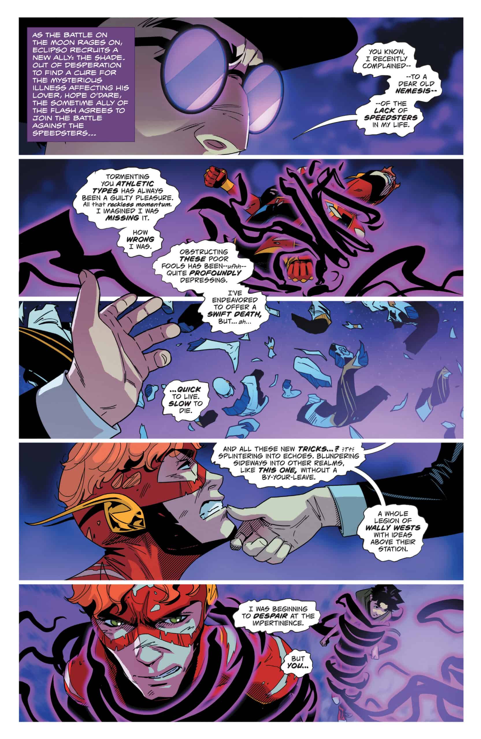 As the war rages on the Moon, Jai West and one of the temp Flashes enter Eclipso’s new form in an attempt to stop the total blackout of the Sun! A
