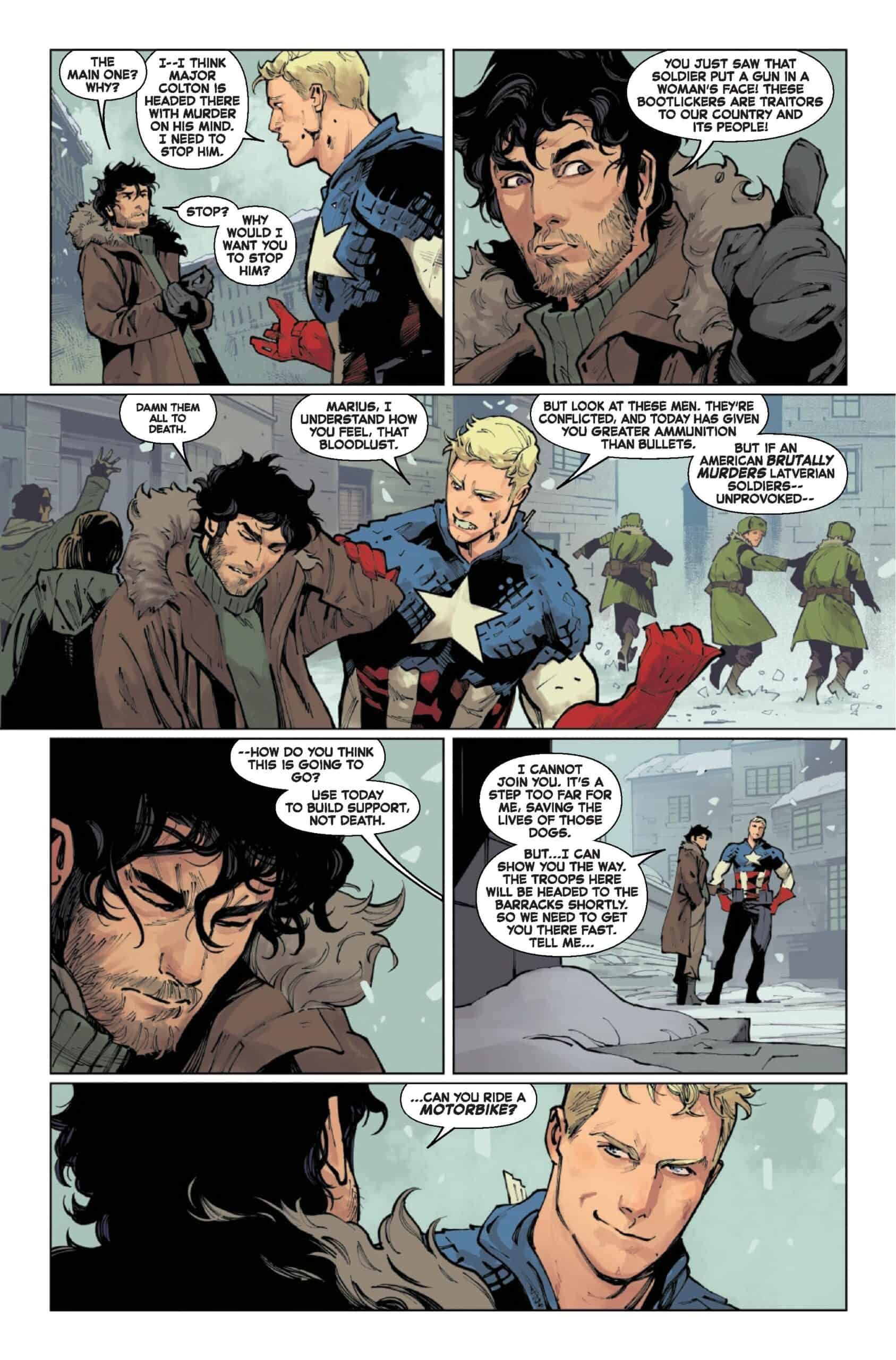 As Steve learns the true nature of his mission into Latveria, he finds himself at odds with his former ally DAVE COLTON — the current CAPTAIN AMERICA, whose path to freedom grows more violent by the day. Who will be the last Captain left standing?
