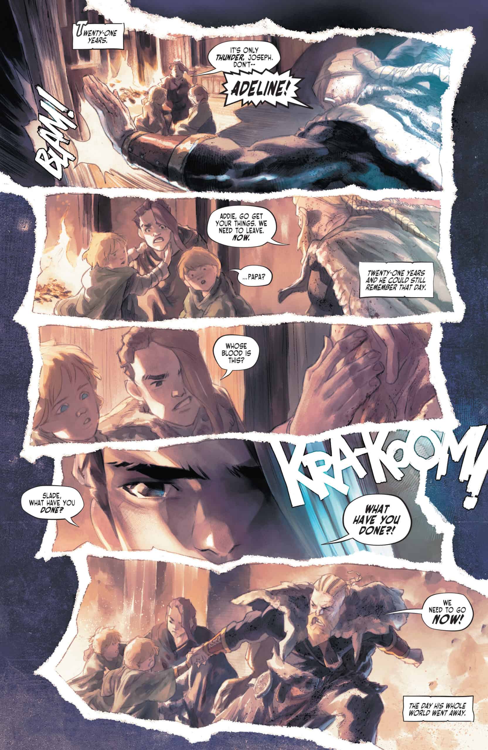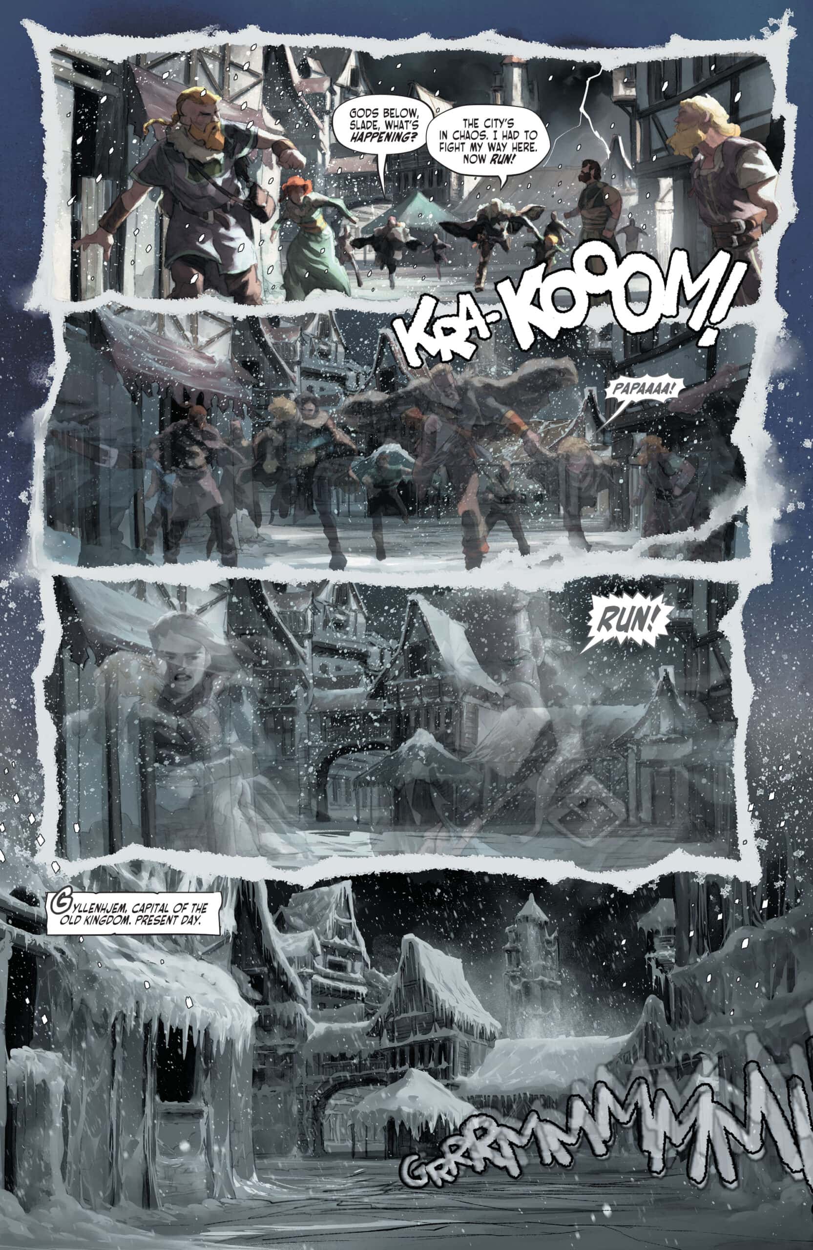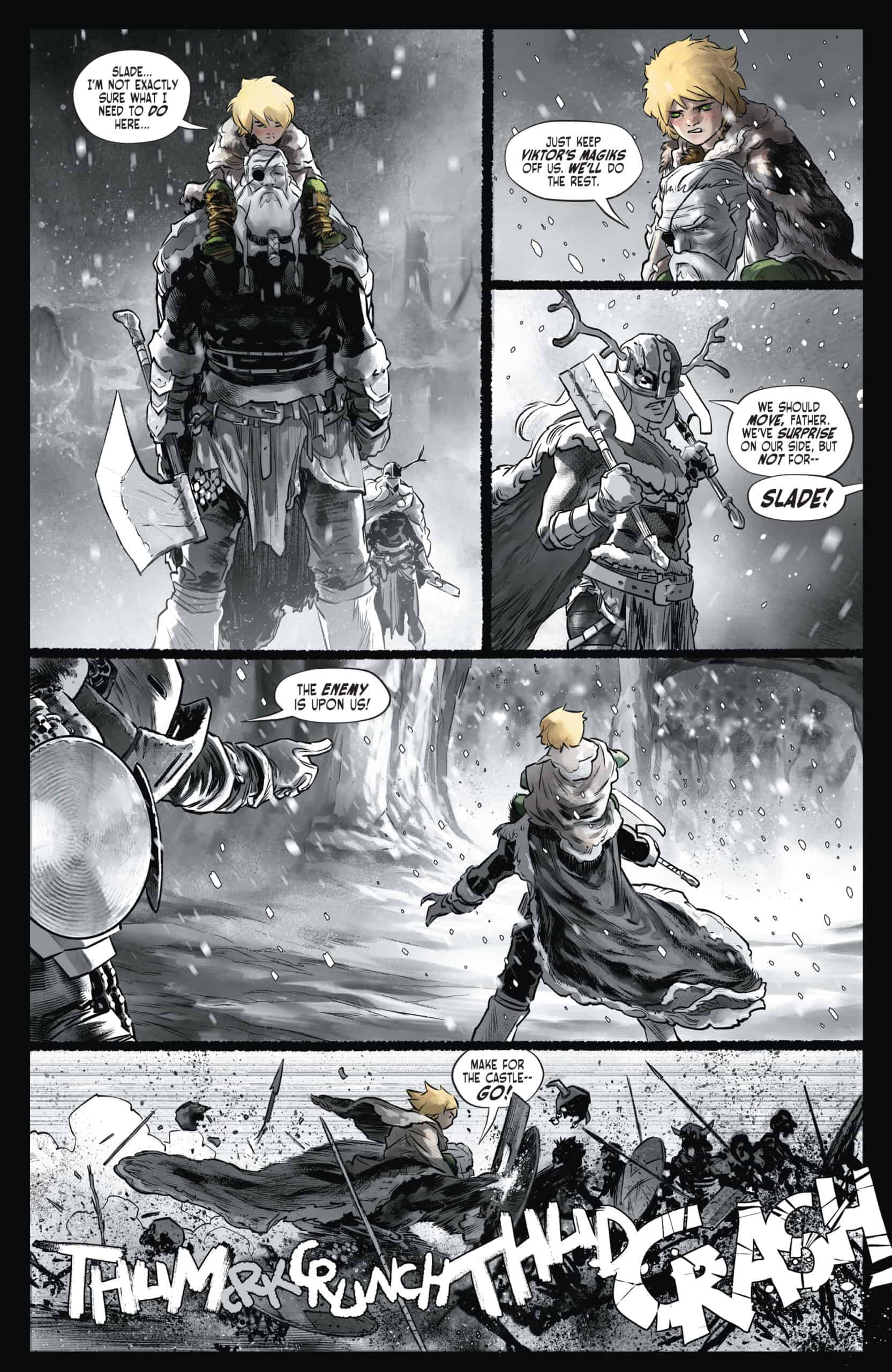 Our story snowballs to its epic conclusion as Slade Wilson and his unlikely band of allies and enemies hack and slash their way through the zombie-ridden streets of Gyllenhjem to bring an end to magus Viktor of House Fries’ icy grip on the realm, at long last. But Viktor still has tricks up his sleeve, including one that could bring even the fearsome Deathstroke to his knees…