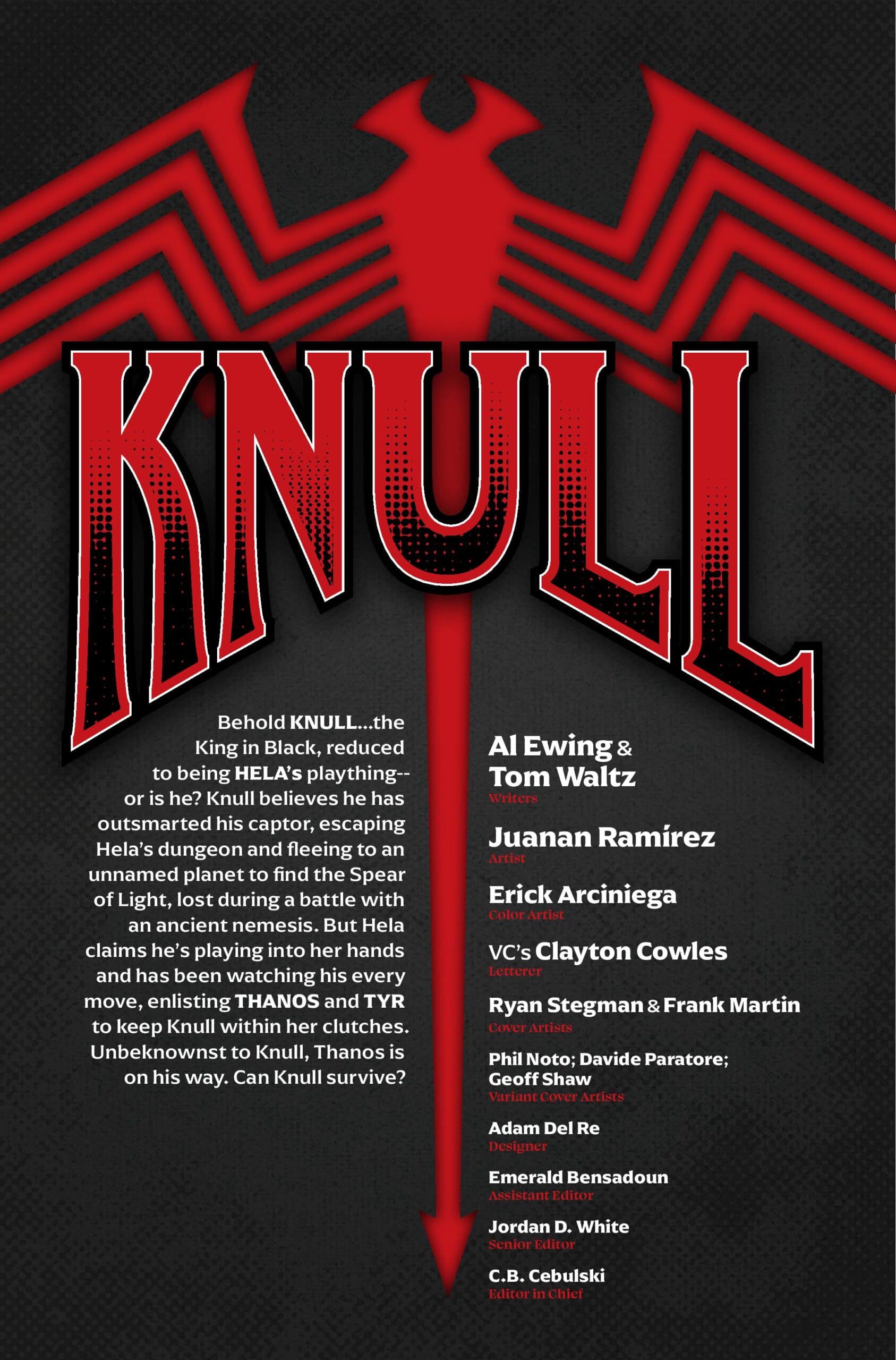 Knull made a not-so-triumphant return in VENOM #250, the milestone issue by writers Al Ewing and Charles Soule and artists Terry Dodson, Carlos Gomez and Todd Nauck, resurfacing as a helpless prisoner of Hela, now calling herself the QUEEN IN BLACK!