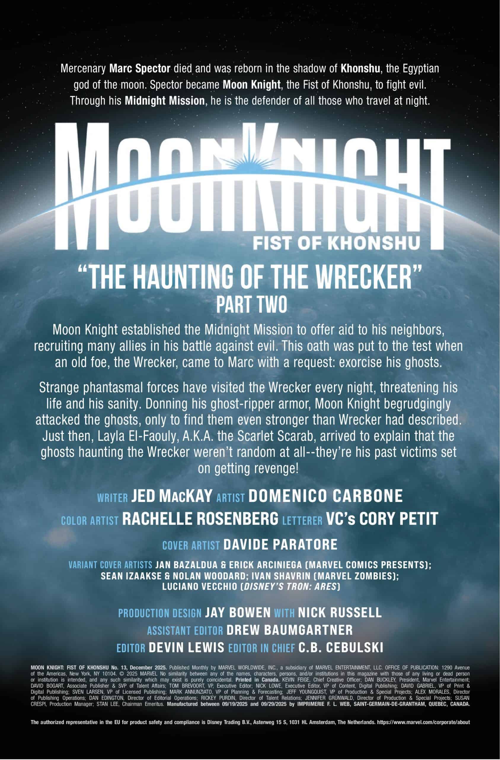 Marc Spector moonlights as a ghost hunter to settle a score in Moon Knight: Fist of Khonshu #13 on shelves and digital platforms on October 22, 2025, from Marvel Comics