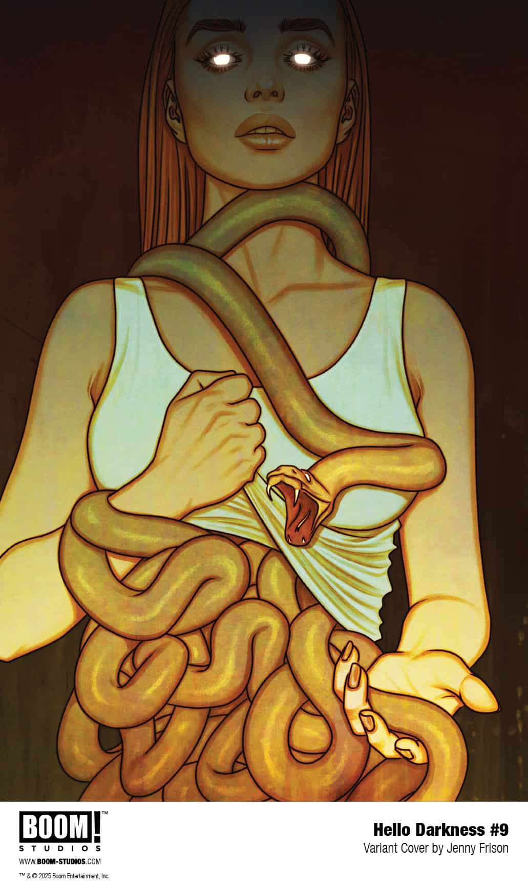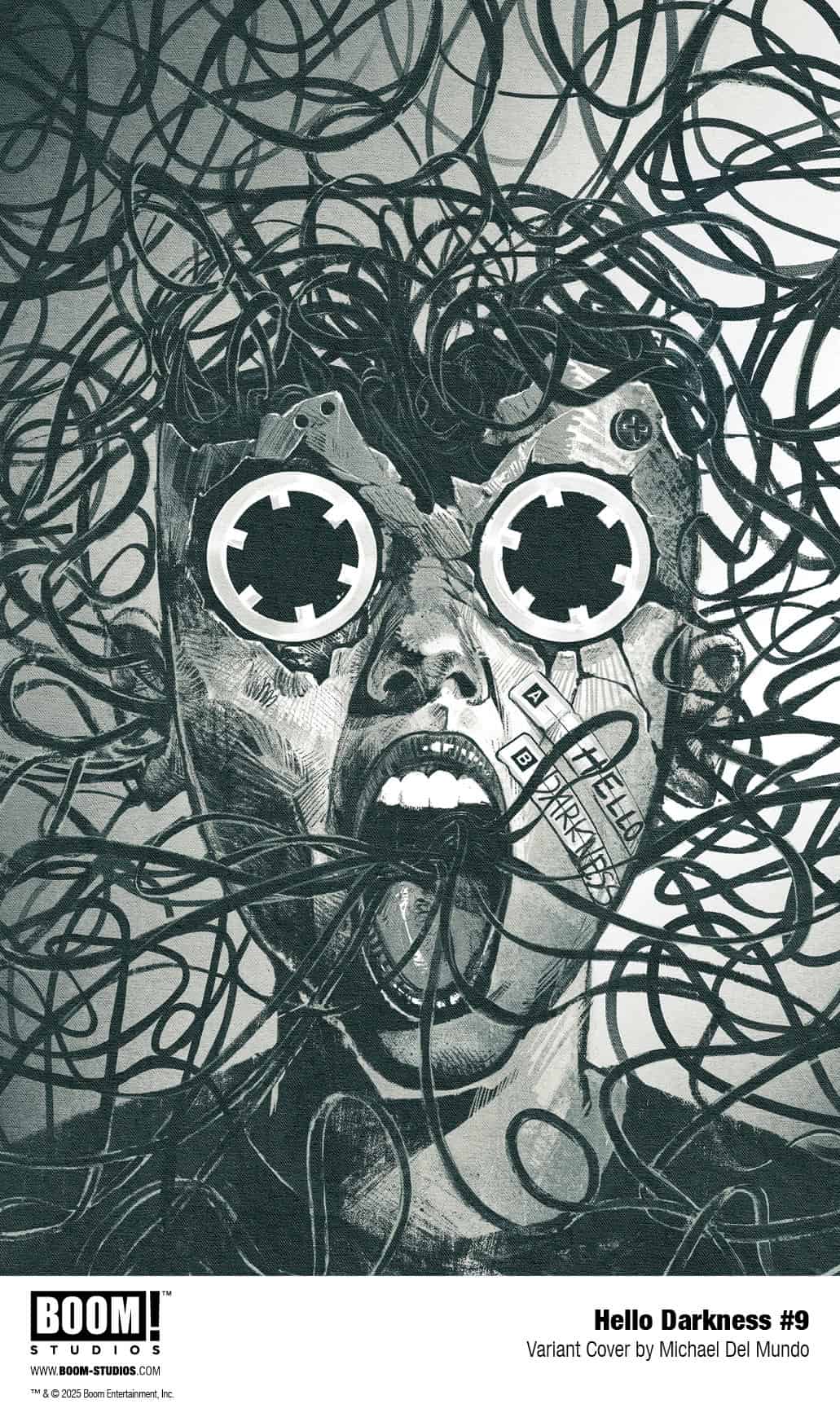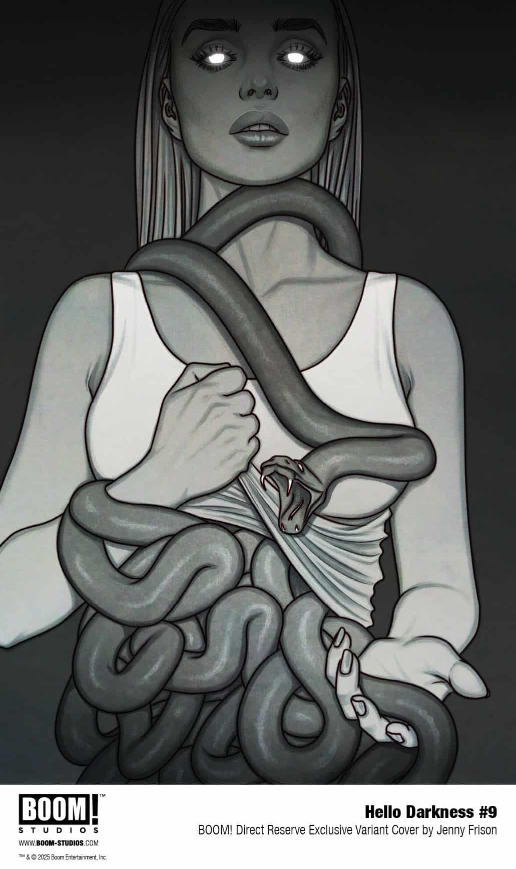 HELLO DARKNESS #9features a main cover by Miguel Mercado (The Amazing Spider-Man), and variant covers by Jenny Frison (Something is Killing the Children) and Michael Del Mundo (Vision), a special BOOM! Studios 20th Anniversary variant by Goñi Montes (Mighty Morphin Power Rangers), and a limited BOOM! Studios Direct Reserve exclusive variant by Jenny Frison!